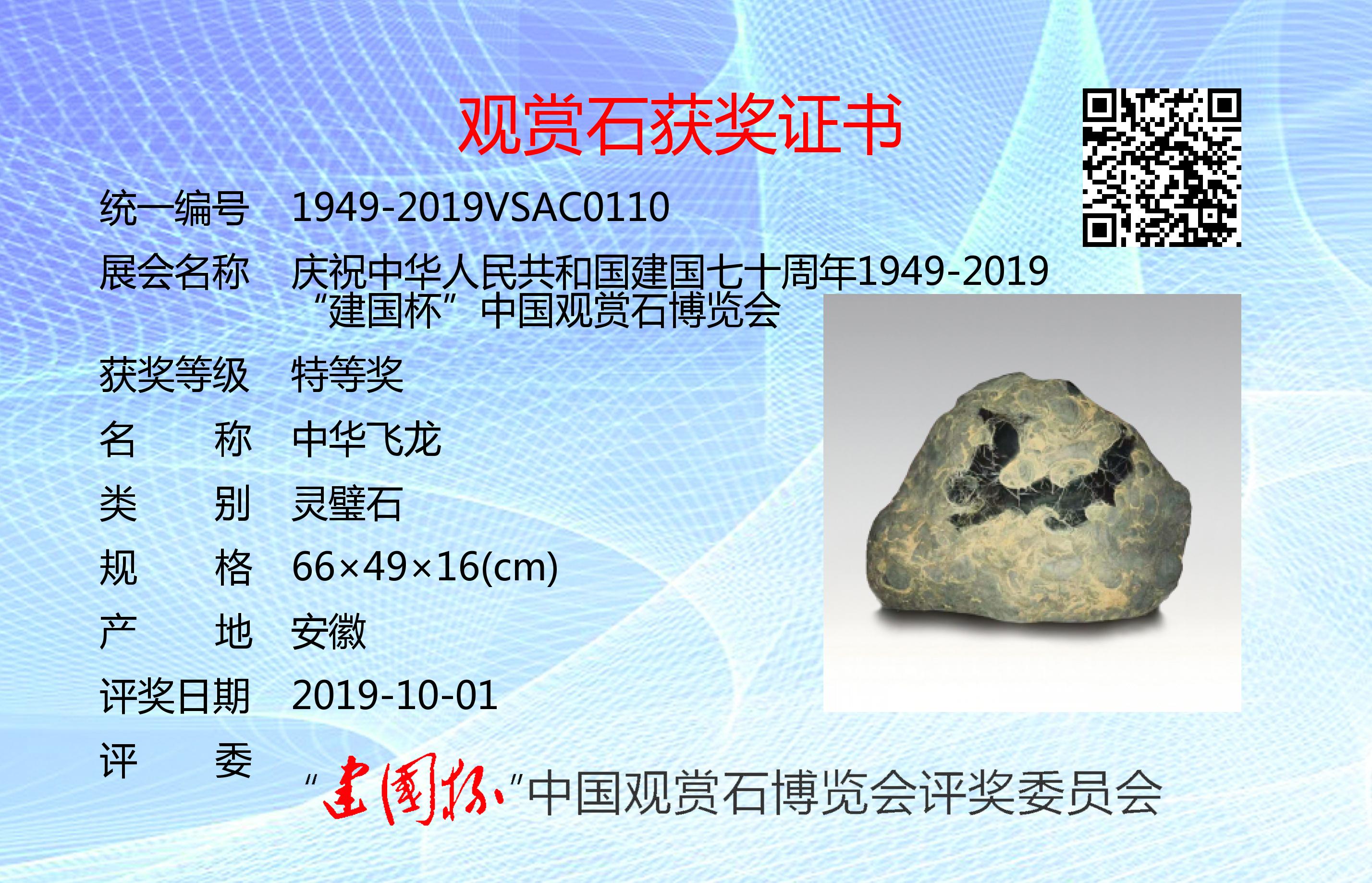 为庆祝建国七十周年,凝聚文化强国之力,推进赏石艺术发展,以最美的赏石精品向共和国生日献礼,特隆重举办了“建国杯”观赏石博览会。本次展会设特等奖、金奖、银奖、入围奖若干(各奖项不设名额限制,采用专家独立鉴评打分,平均鉴评得分91分以上获特等奖;81~90分获金奖;71~80分获银奖;61~70分获入围奖;61以下不获奖。鉴评标准:《观赏石鉴评》GB/T31390-2015)。本次评奖实际日期为2019年9月12日,为了突出纪念意义,证书上评奖日期统一为:2019年10月1日。