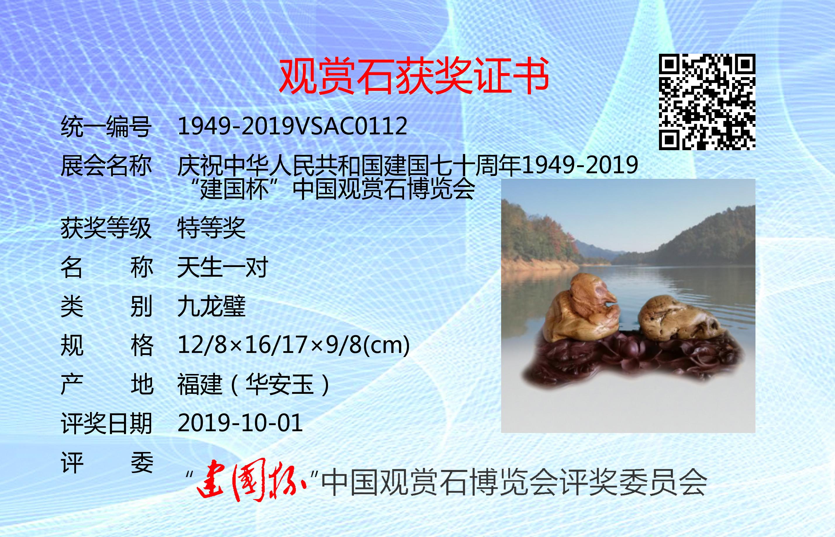 为庆祝建国七十周年,凝聚文化强国之力,推进赏石艺术发展,以最美的赏石精品向共和国生日献礼,特隆重举办了“建国杯”观赏石博览会。本次展会设特等奖、金奖、银奖、入围奖若干(各奖项不设名额限制,采用专家独立鉴评打分,平均鉴评得分91分以上获特等奖;81~90分获金奖;71~80分获银奖;61~70分获入围奖;61以下不获奖。鉴评标准:《观赏石鉴评》GB/T31390-2015)。本次评奖实际日期为2019年9月12日,为了突出纪念意义,证书上评奖日期统一为:2019年10月1日。