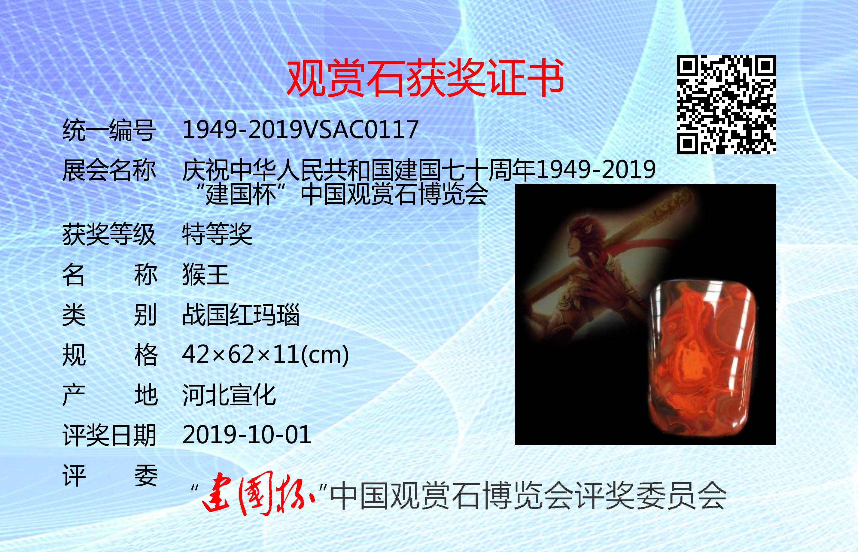 为庆祝建国七十周年,凝聚文化强国之力,推进赏石艺术发展,以最美的赏石精品向共和国生日献礼,特隆重举办了“建国杯”观赏石博览会。本次展会设特等奖、金奖、银奖、入围奖若干(各奖项不设名额限制,采用专家独立鉴评打分,平均鉴评得分91分以上获特等奖;81~90分获金奖;71~80分获银奖;61~70分获入围奖;61以下不获奖。鉴评标准:《观赏石鉴评》GB/T31390-2015)。本次评奖实际日期为2019年9月12日,为了突出纪念意义,证书上评奖日期统一为:2019年10月1日。