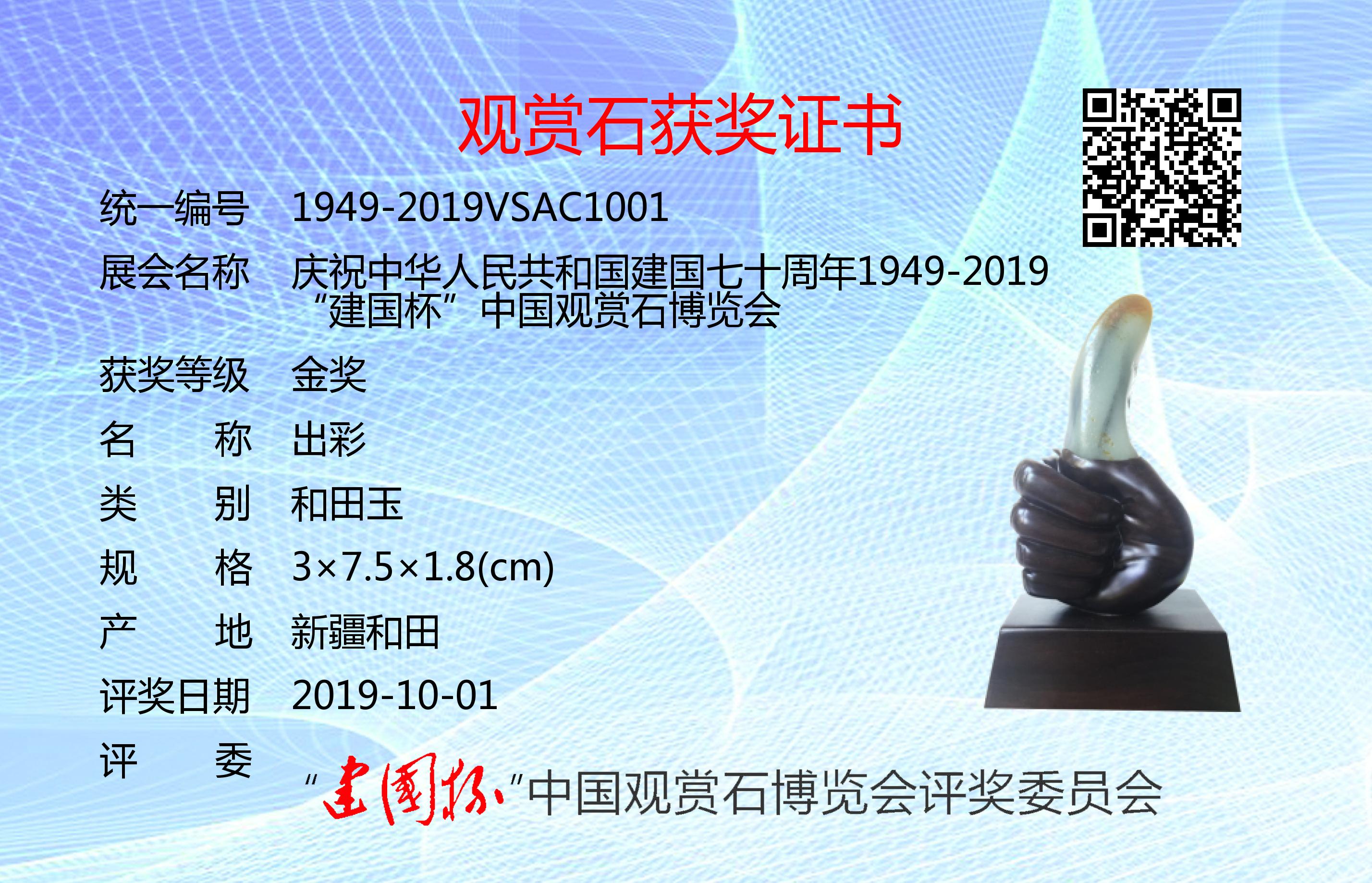 转让价:5万元。为庆祝建国七十周年,凝聚文化强国之力,推进赏石艺术发展,以最美的赏石精品向共和国生日献礼,特隆重举办了“建国杯”观赏石博览会。本次展会设特等奖、金奖、银奖、入围奖若干(各奖项不设名额限制,采用专家独立鉴评打分,平均鉴评得分91分以上获特等奖;81~90分获金奖;71~80分获银奖;61~70分获入围奖;61以下不获奖。鉴评标准:《观赏石鉴评》GB/T31390-2015)。本次评奖实际日期为2019年9月12日,为了突出纪念意义,证书上评奖日期统一为:2019年10月1日。