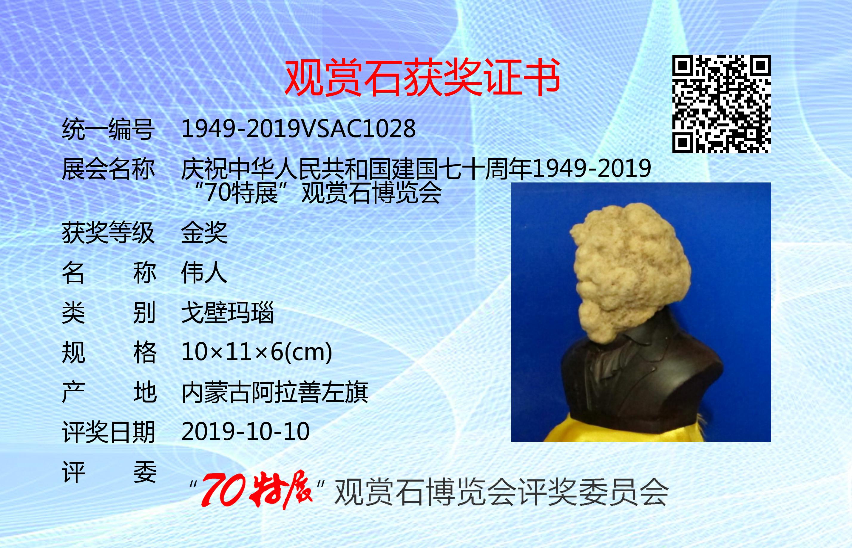 本次网络展会设金奖若干(不设名额限制,采用专家独立鉴评打分,平均鉴评得分81分及以上获金奖;鉴评得分81分以下或题材不符者,不获奖。鉴评标准:《观赏石鉴评》GB/T31390-2015)。此石自然、完整、形神似伟人庄严慈祥气质,雕琢石像的风格淋漓尽致。集形态、质地、色彩、纹理、韵味俱佳。