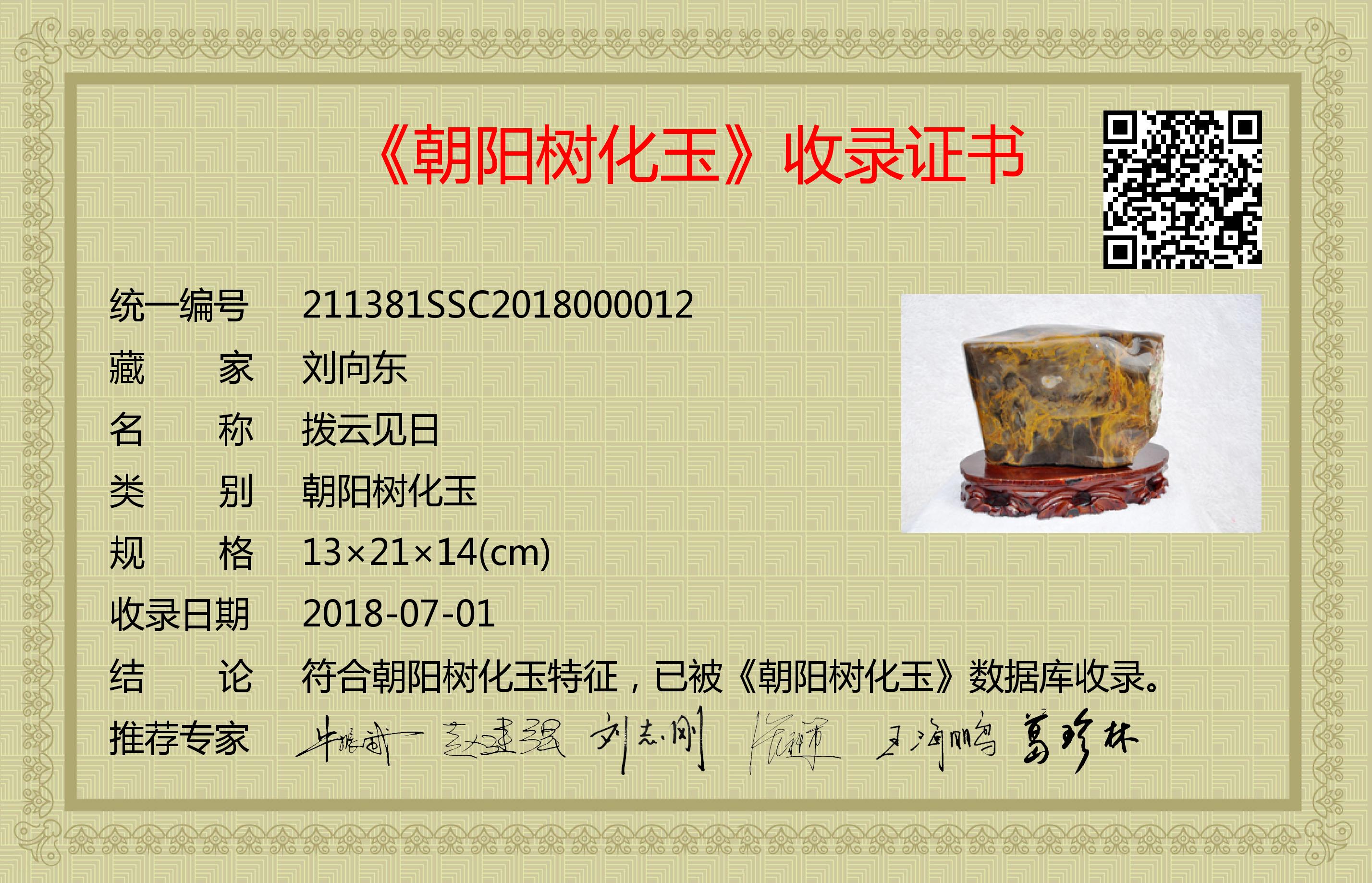 符合朝阳树化玉特征,已被《朝阳树化玉》数据库收录。
