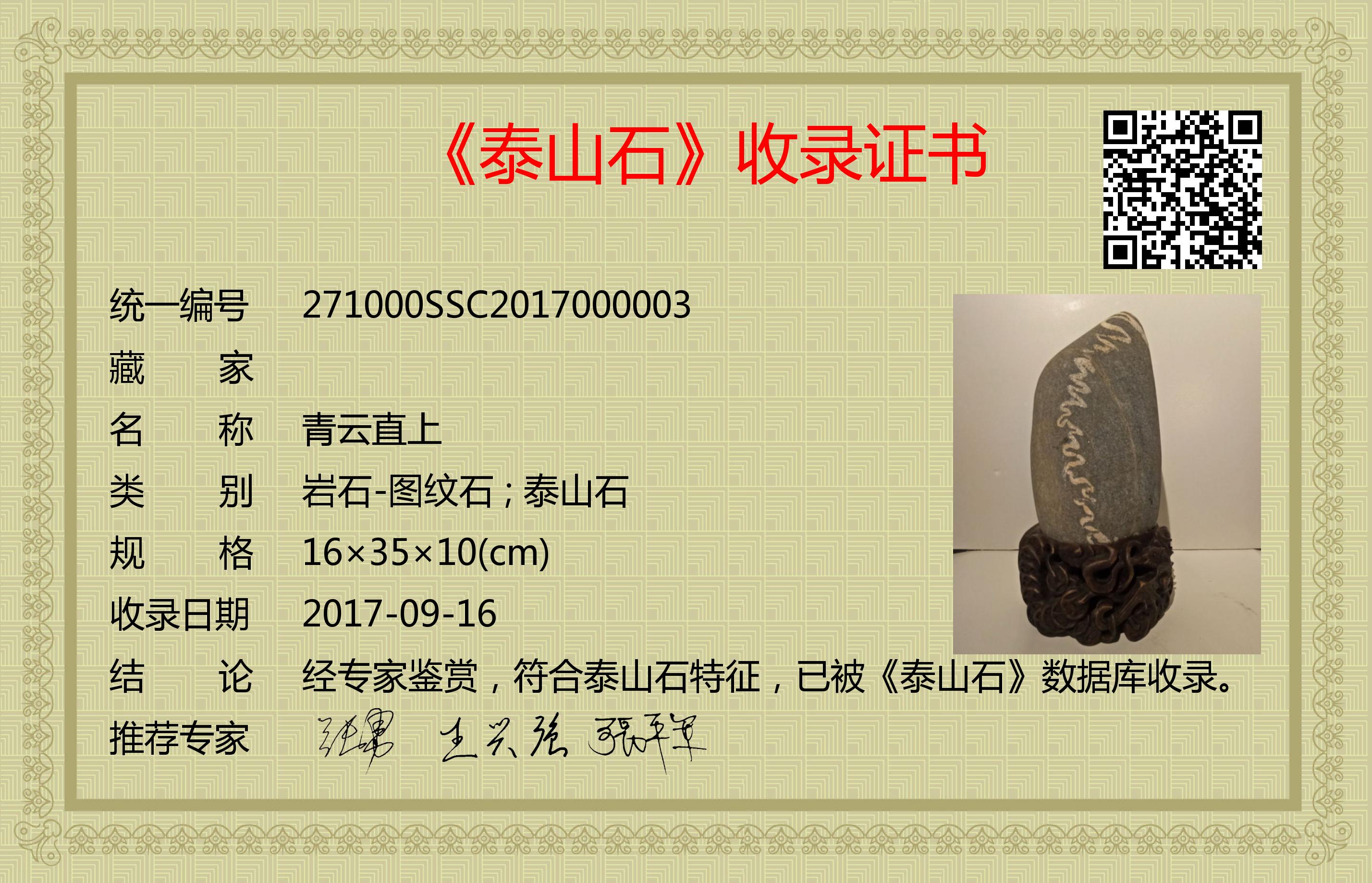 经专家鉴赏,符合泰山石特征,已被《泰山石》数据库收录。