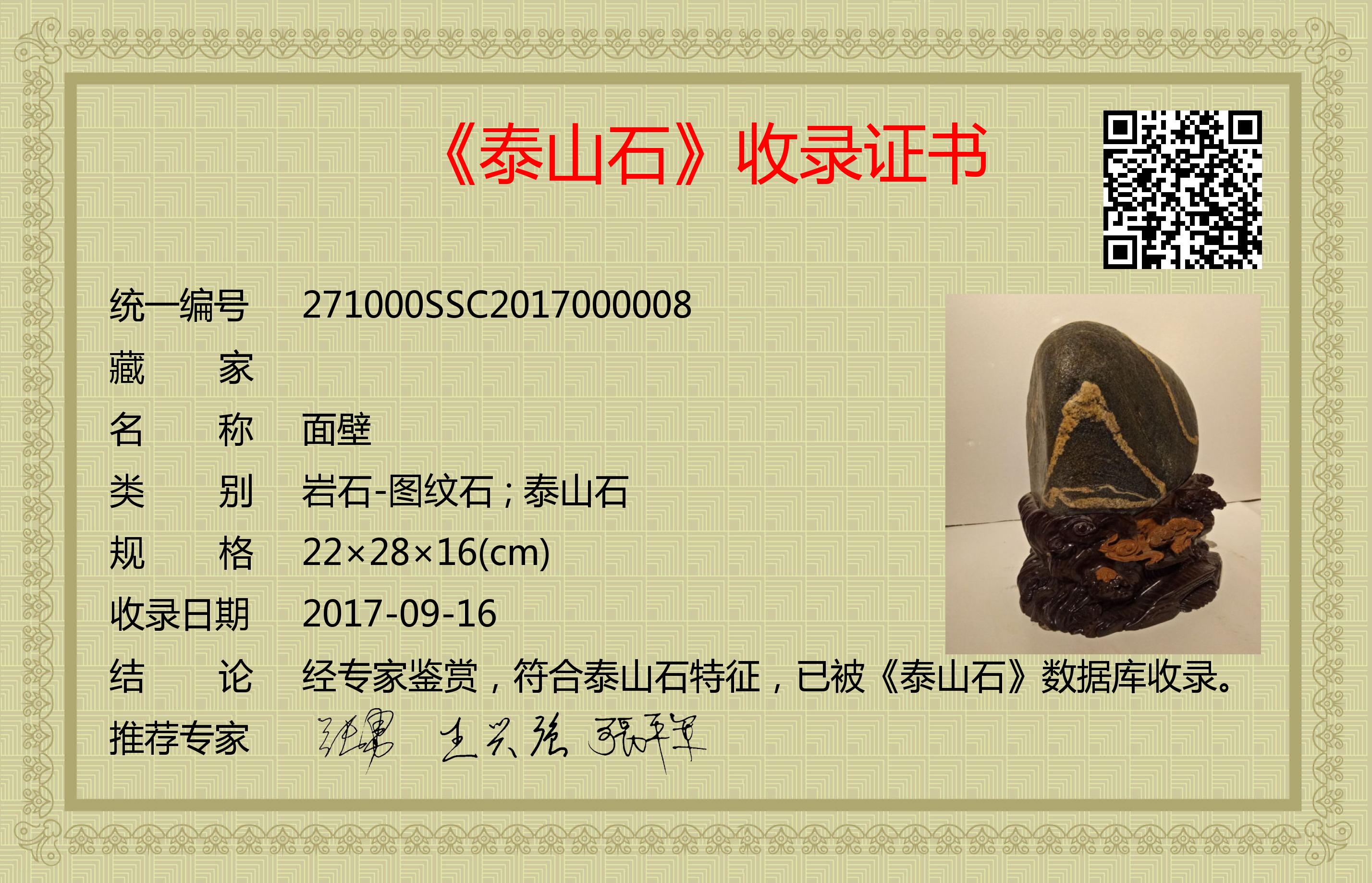 经专家鉴赏,符合泰山石特征,已被《泰山石》数据库收录。