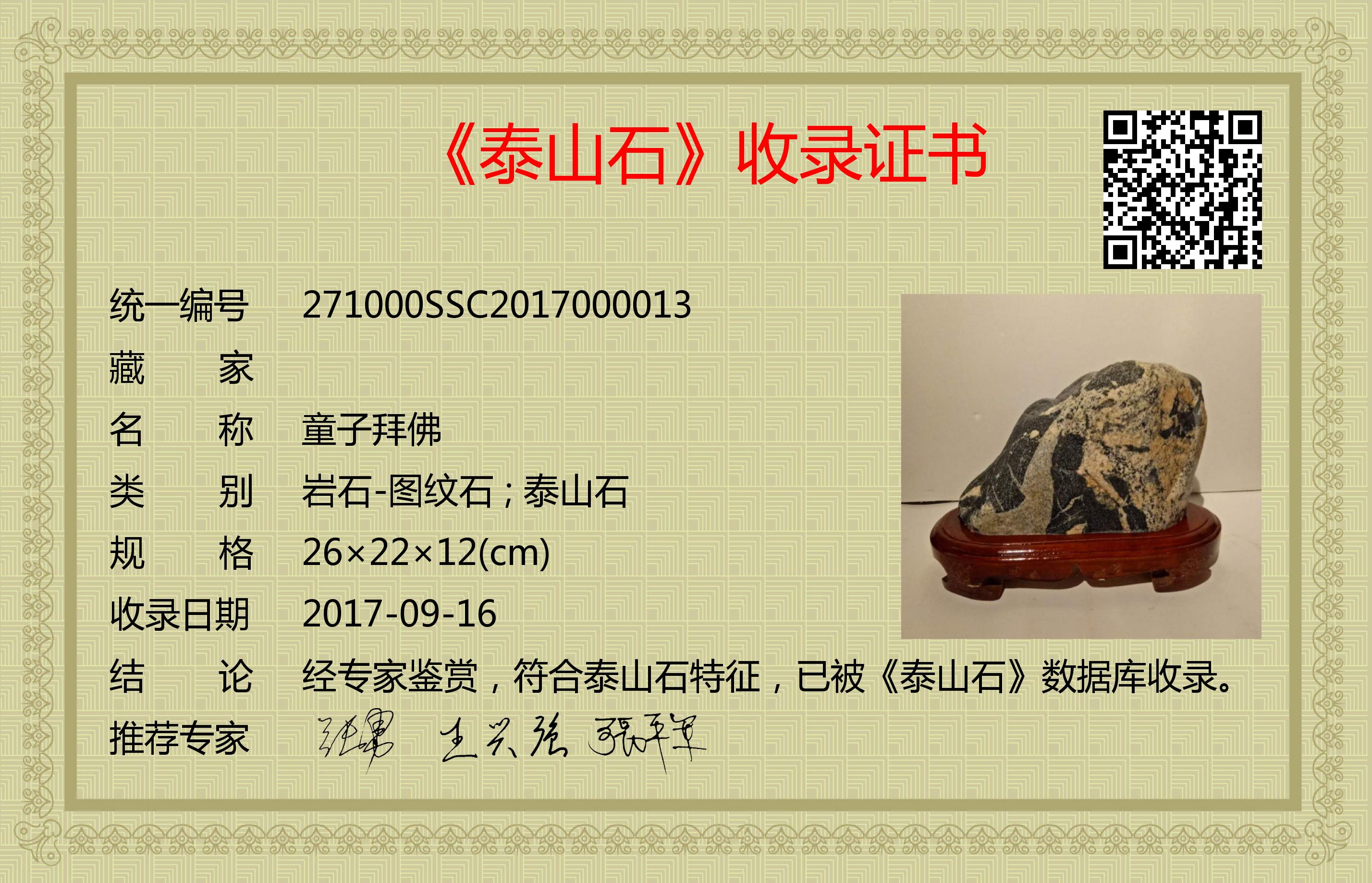 经专家鉴赏,符合泰山石特征,已被《泰山石》数据库收录。