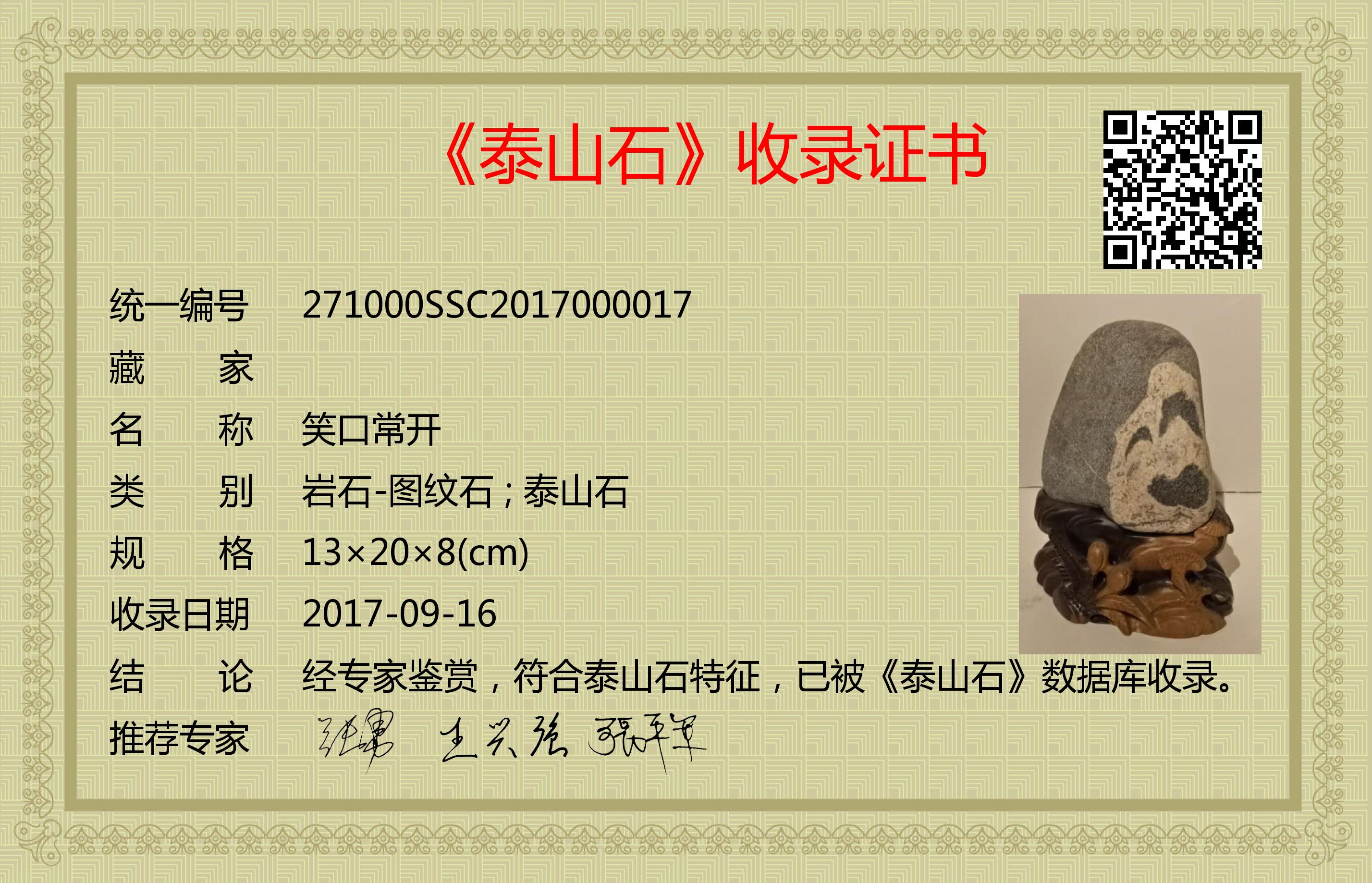 经专家鉴赏,符合泰山石特征,已被《泰山石》数据库收录。