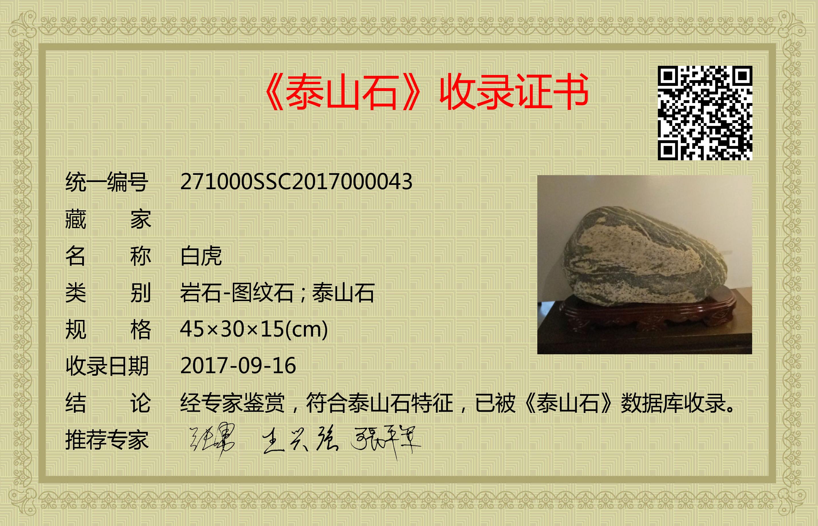 经专家鉴赏,符合泰山石特征,已被《泰山石》数据库收录。