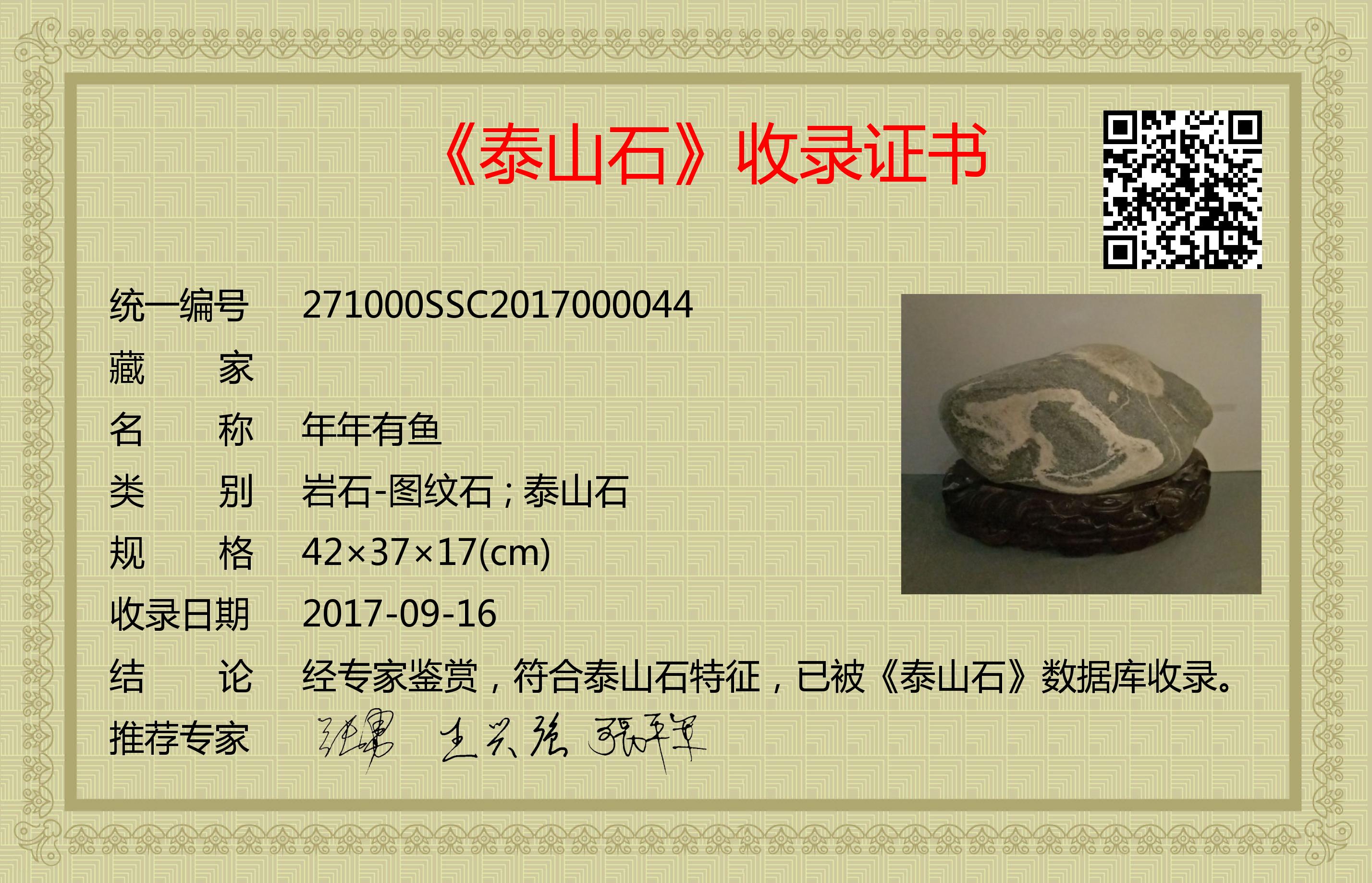 经专家鉴赏,符合泰山石特征,已被《泰山石》数据库收录。
