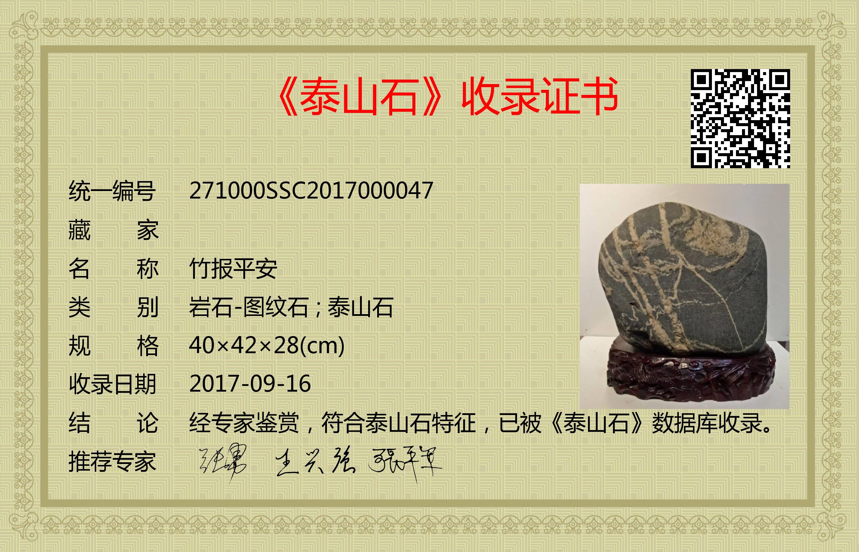 经专家鉴赏,符合泰山石特征,已被《泰山石》数据库收录。