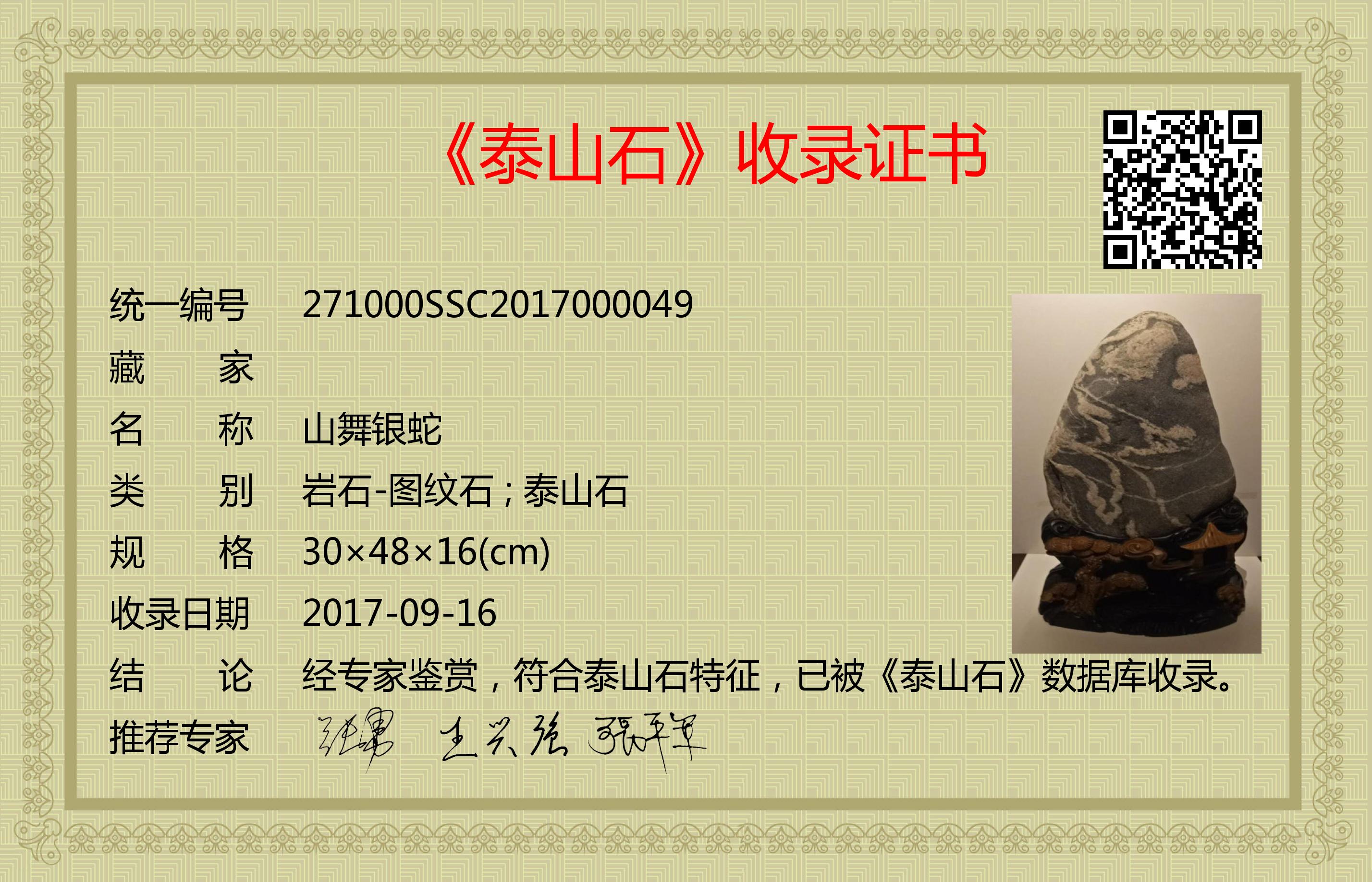 经专家鉴赏,符合泰山石特征,已被《泰山石》数据库收录。