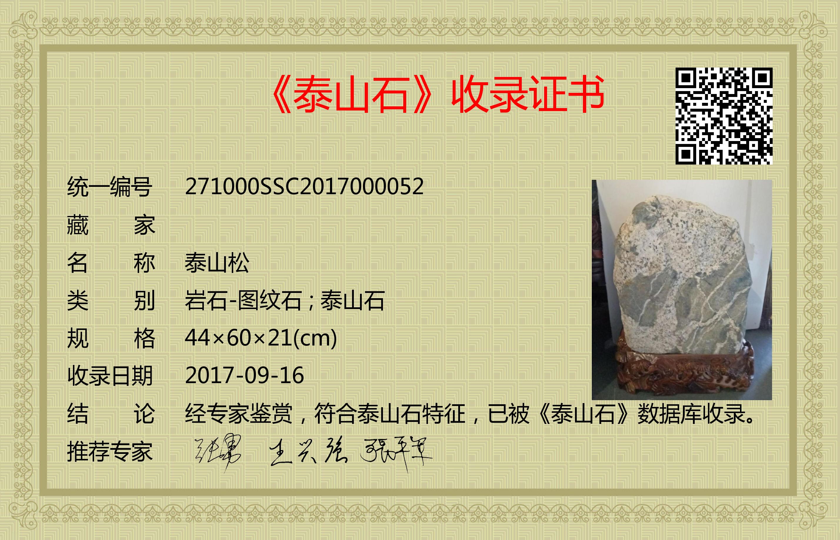 经专家鉴赏,符合泰山石特征,已被《泰山石》数据库收录。