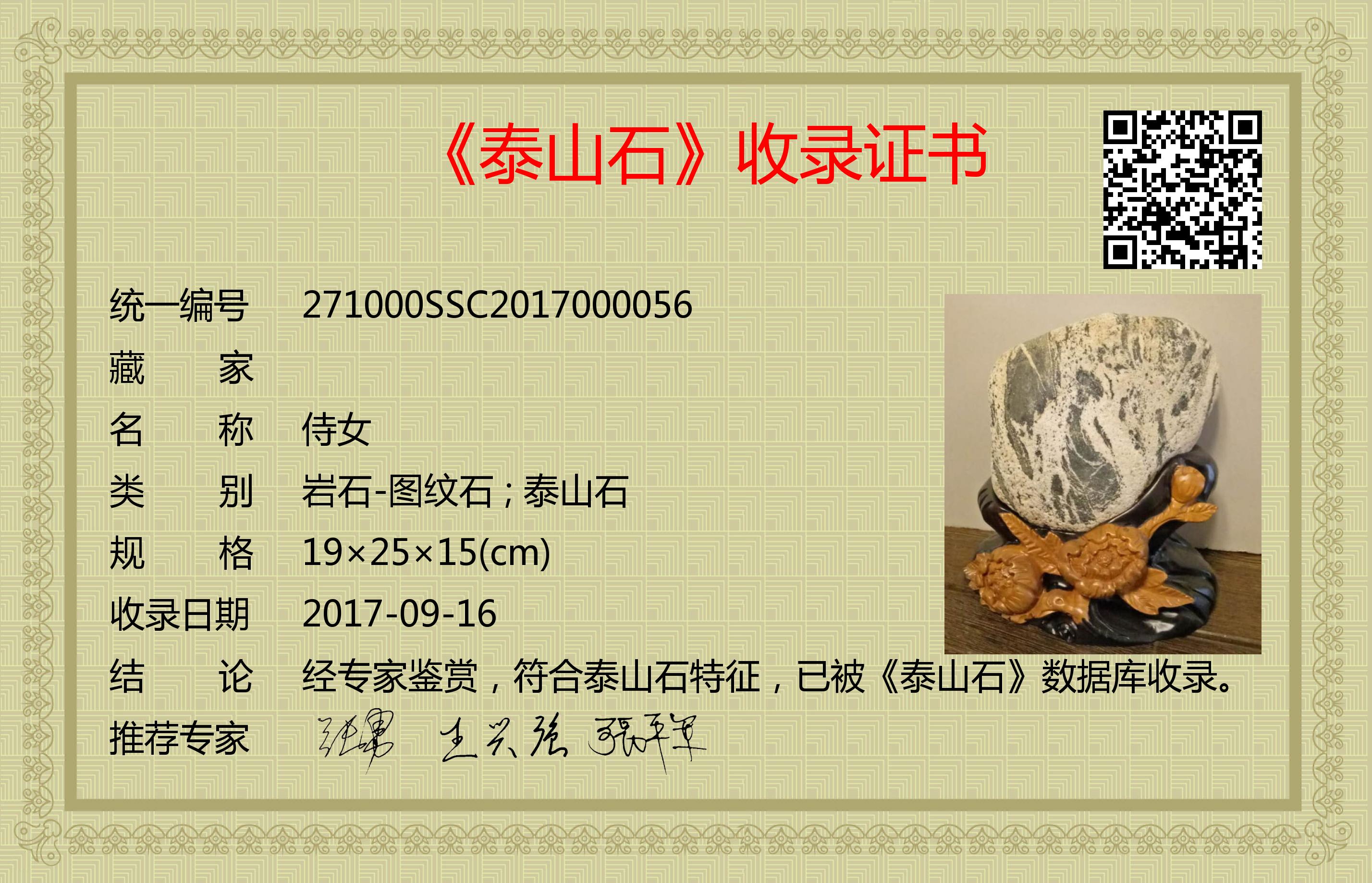 经专家鉴赏,符合泰山石特征,已被《泰山石》数据库收录。