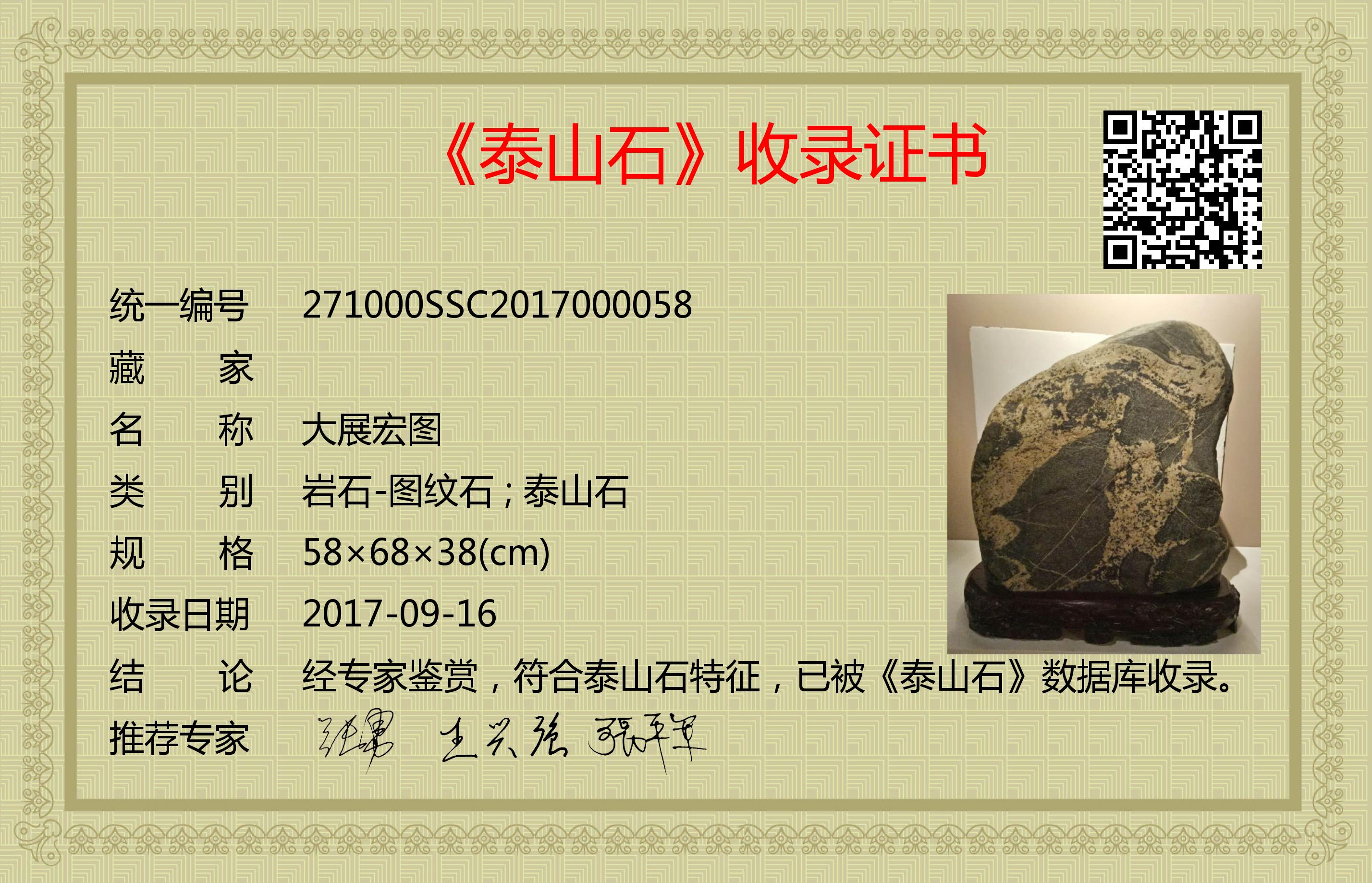经专家鉴赏,符合泰山石特征,已被《泰山石》数据库收录。