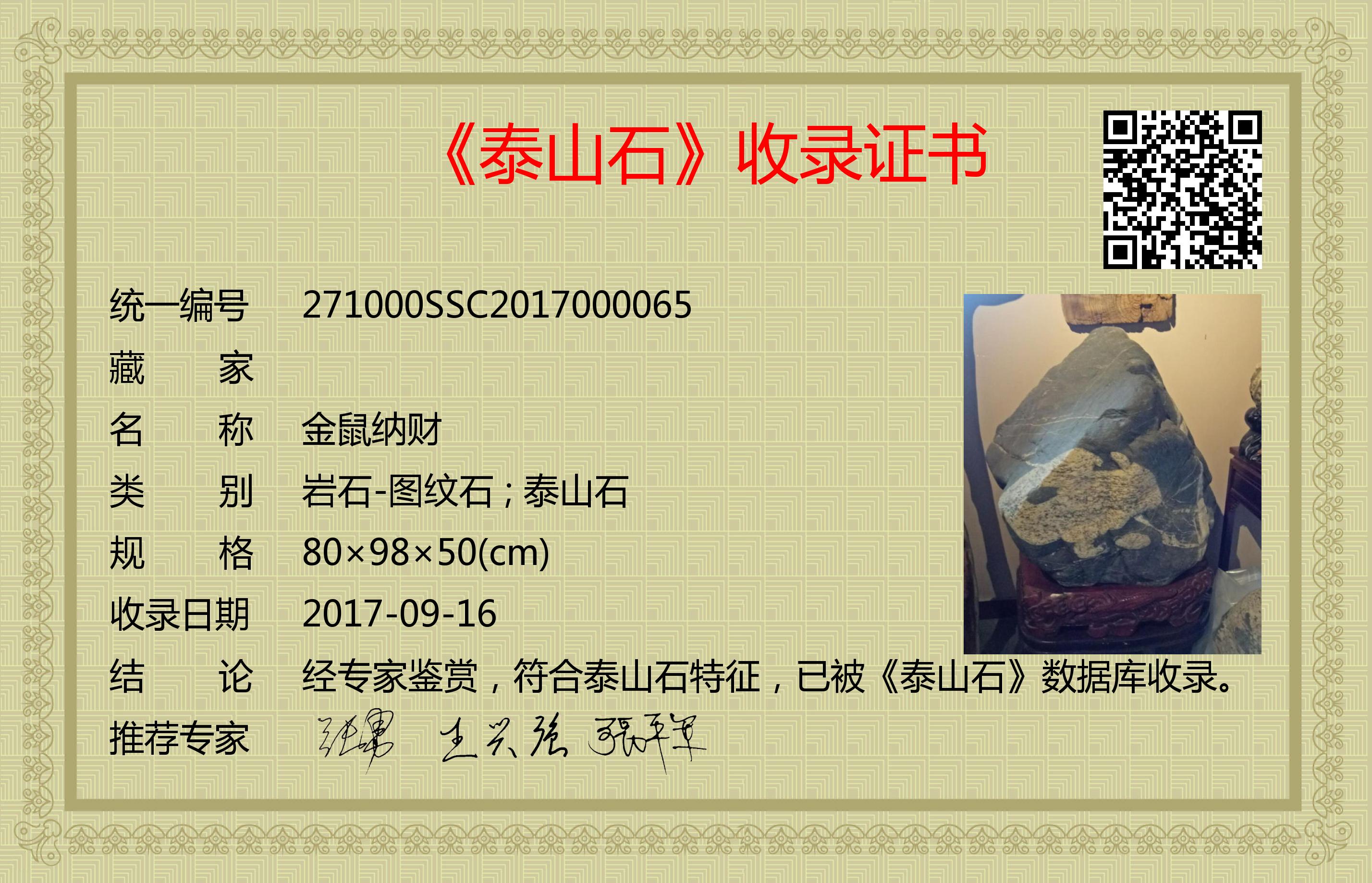 经专家鉴赏,符合泰山石特征,已被《泰山石》数据库收录。