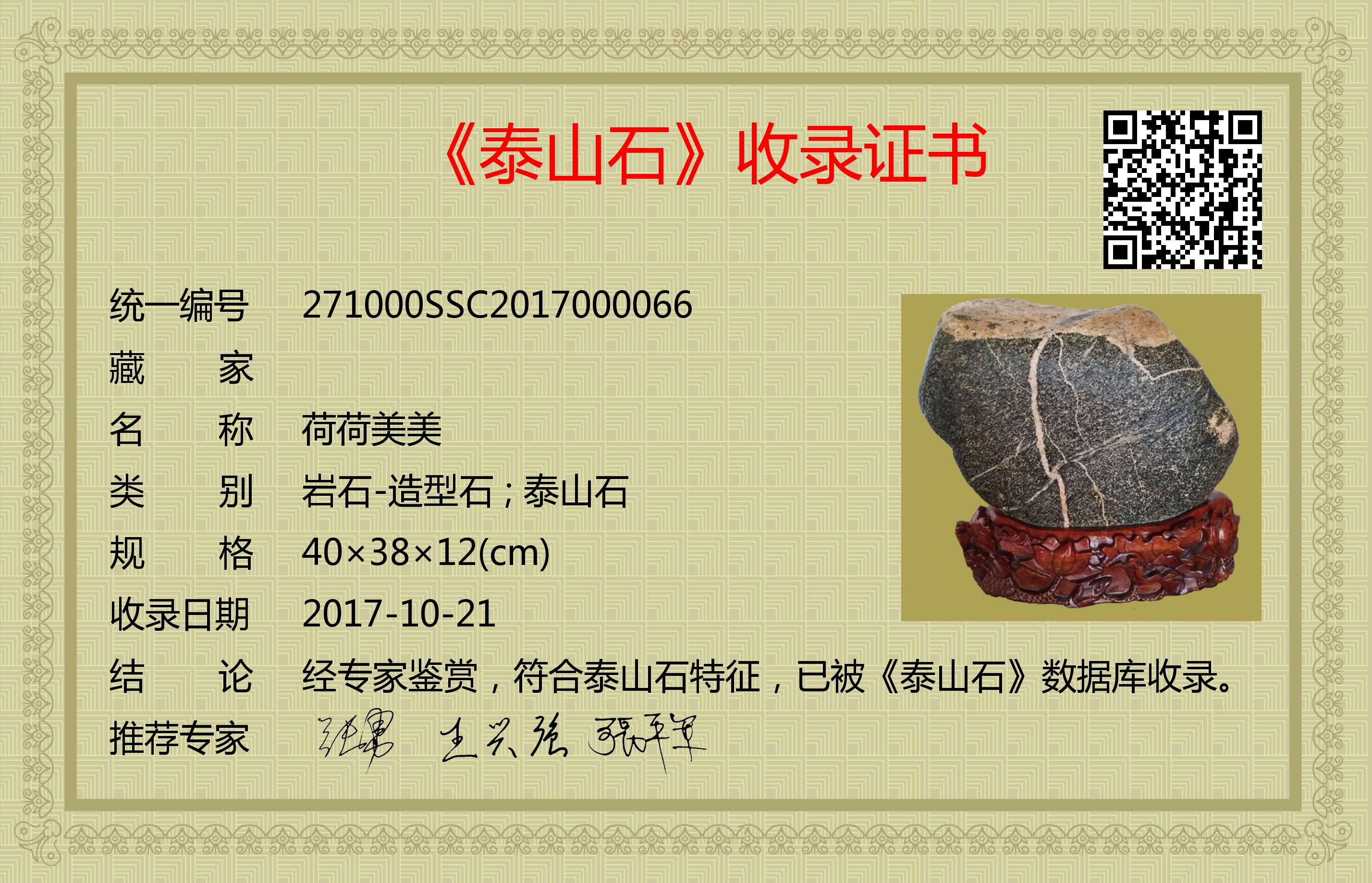 经专家鉴赏,符合泰山石特征,已被《泰山石》数据库收录。