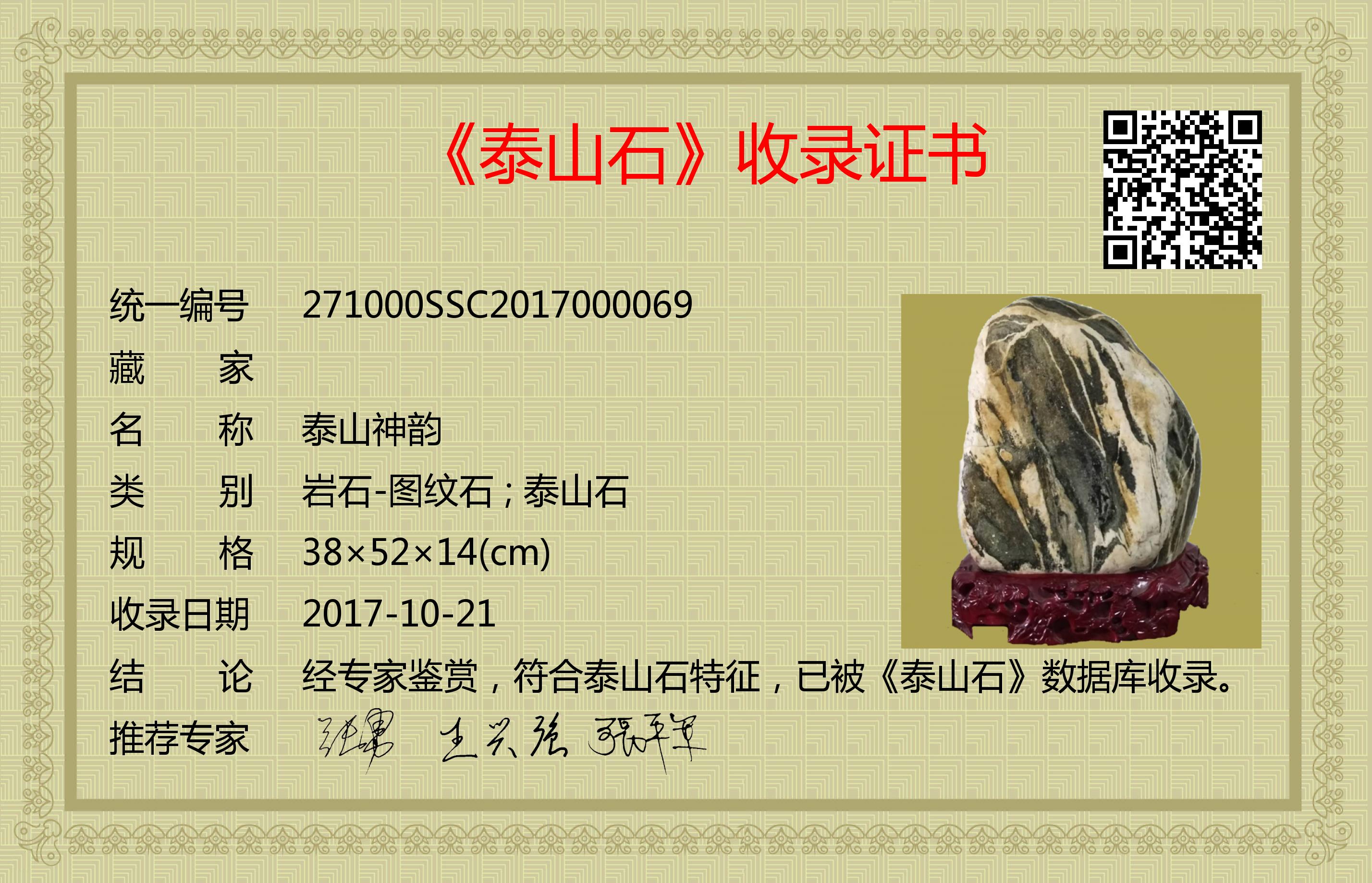 经专家鉴赏,符合泰山石特征,已被《泰山石》数据库收录。