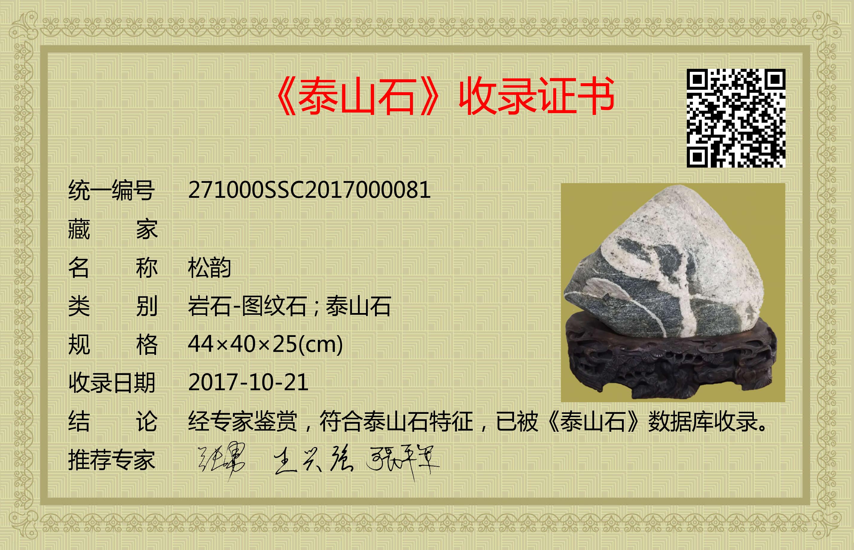 经专家鉴赏,符合泰山石特征,已被《泰山石》数据库收录。
