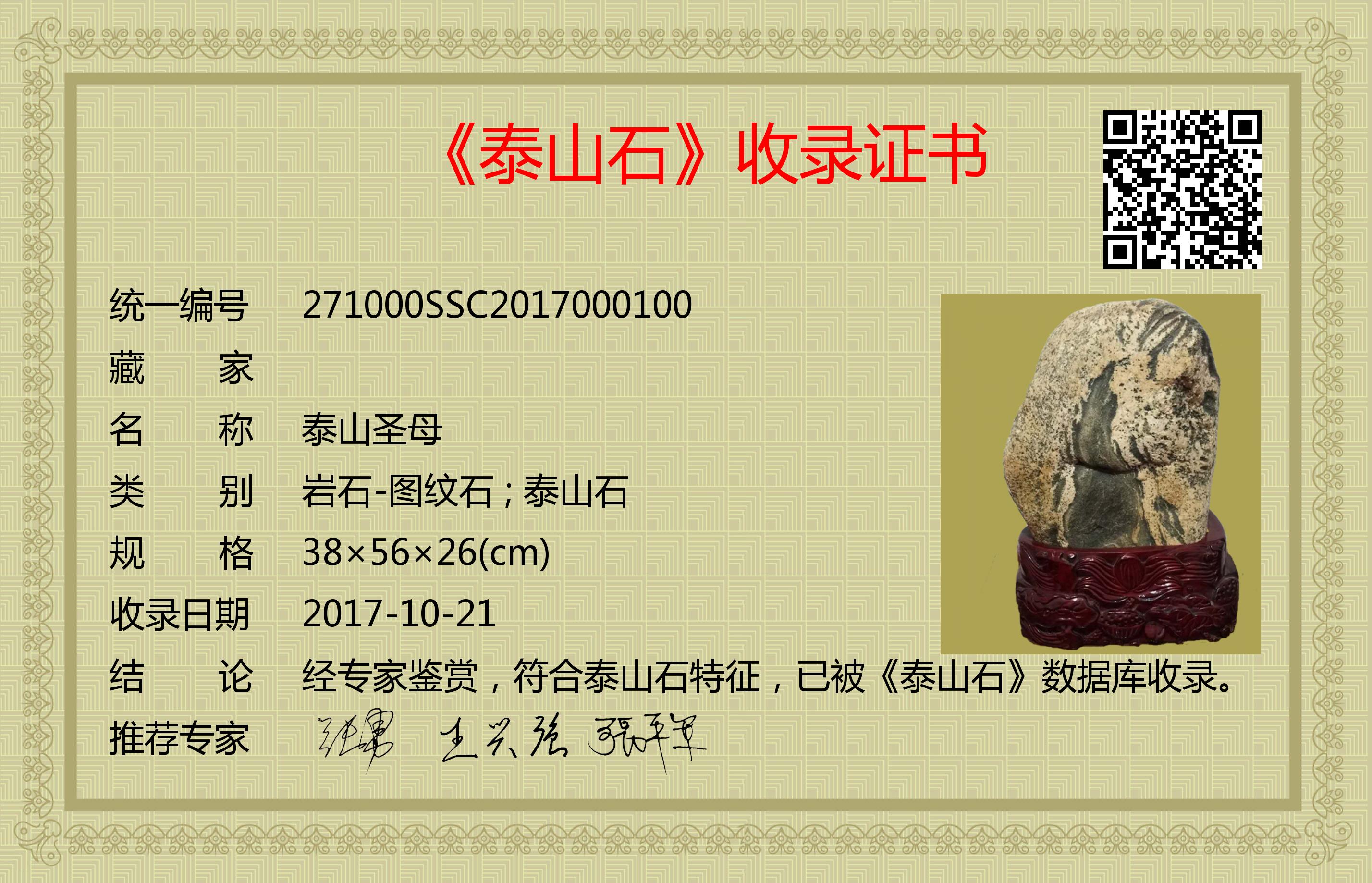 经专家鉴赏,符合泰山石特征,已被《泰山石》数据库收录。