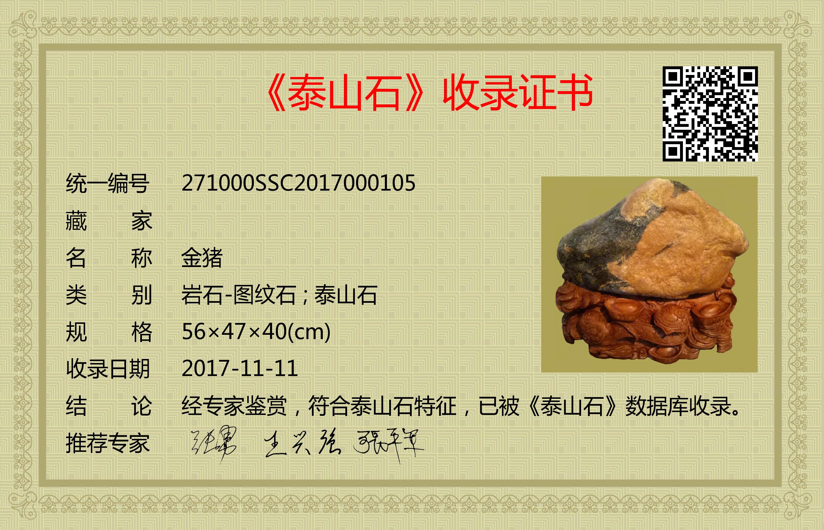 经专家鉴赏,符合泰山石特征,已被《泰山石》数据库收录。