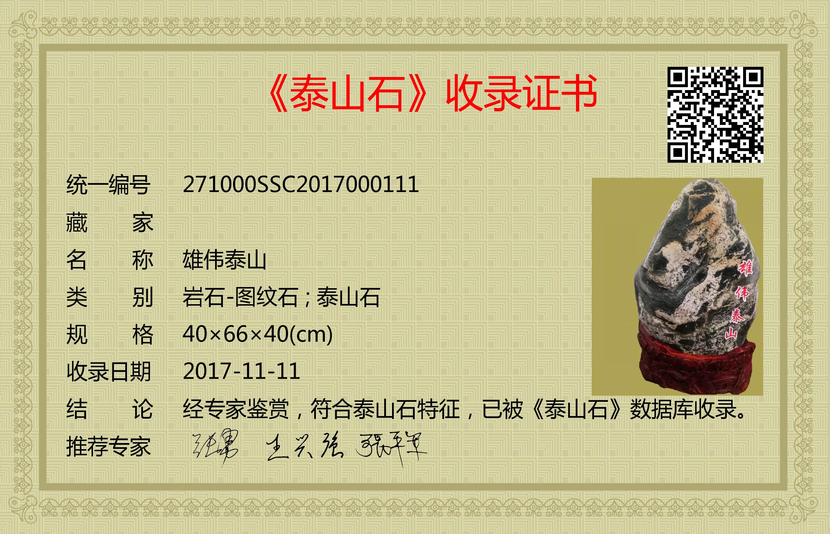 经专家鉴赏,符合泰山石特征,已被《泰山石》数据库收录。