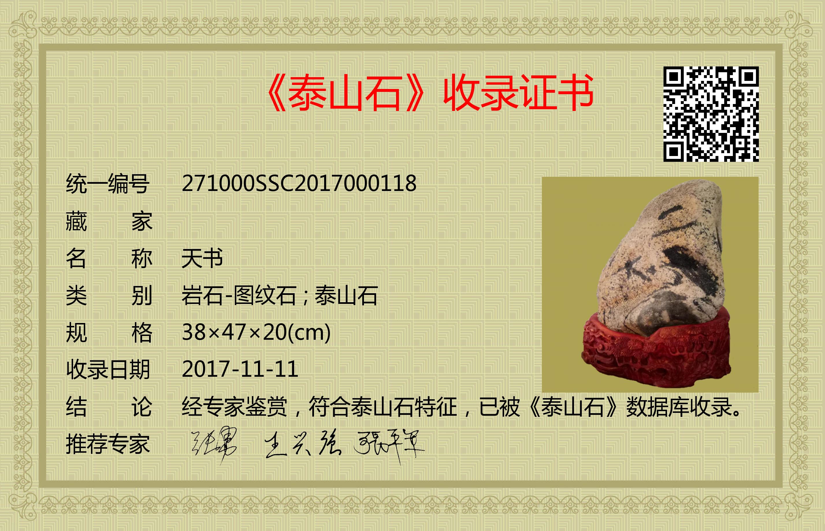 经专家鉴赏,符合泰山石特征,已被《泰山石》数据库收录。