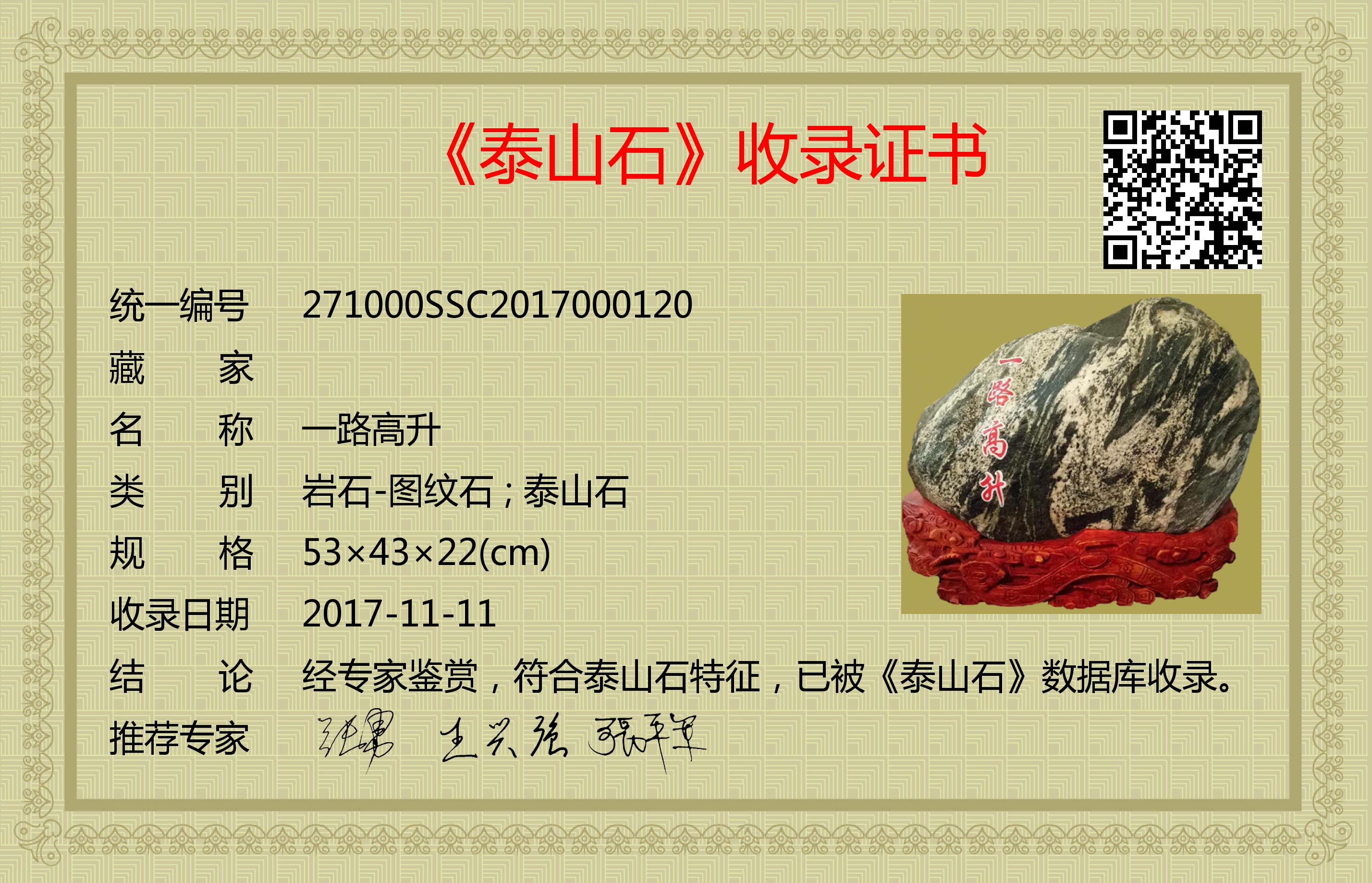 经专家鉴赏,符合泰山石特征,已被《泰山石》数据库收录。