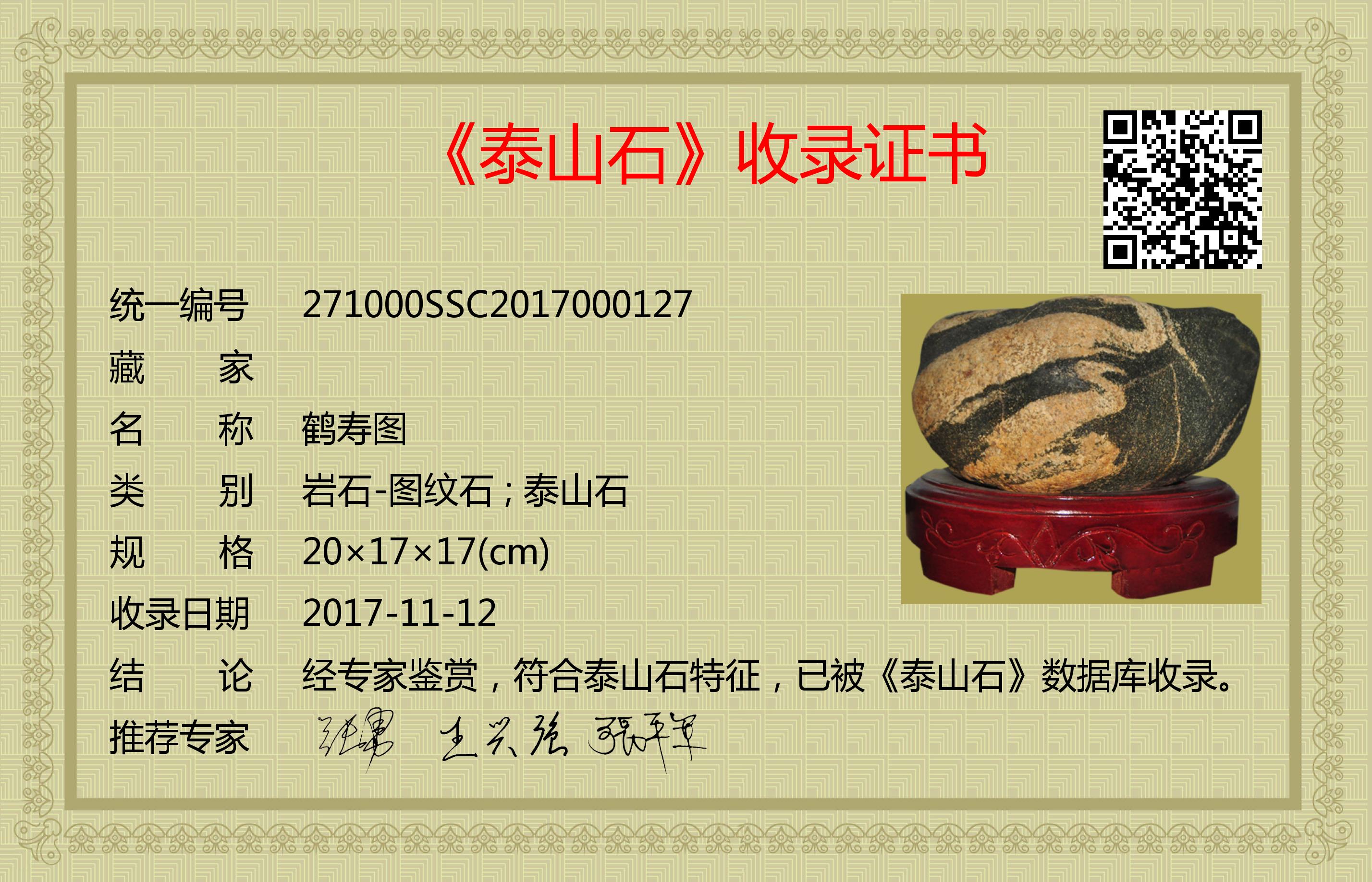 经专家鉴赏,符合泰山石特征,已被《泰山石》数据库收录。