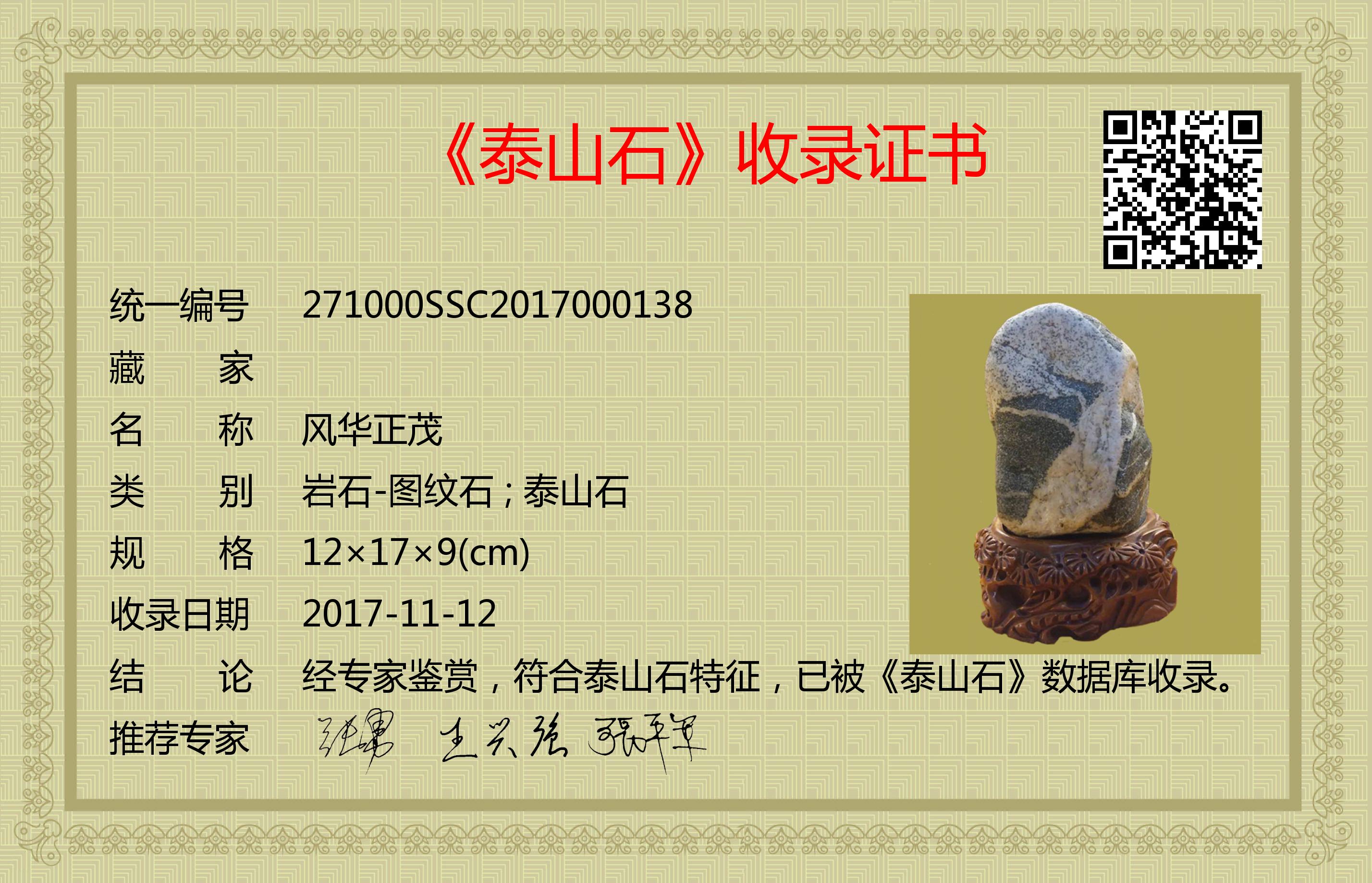 经专家鉴赏,符合泰山石特征,已被《泰山石》数据库收录。
