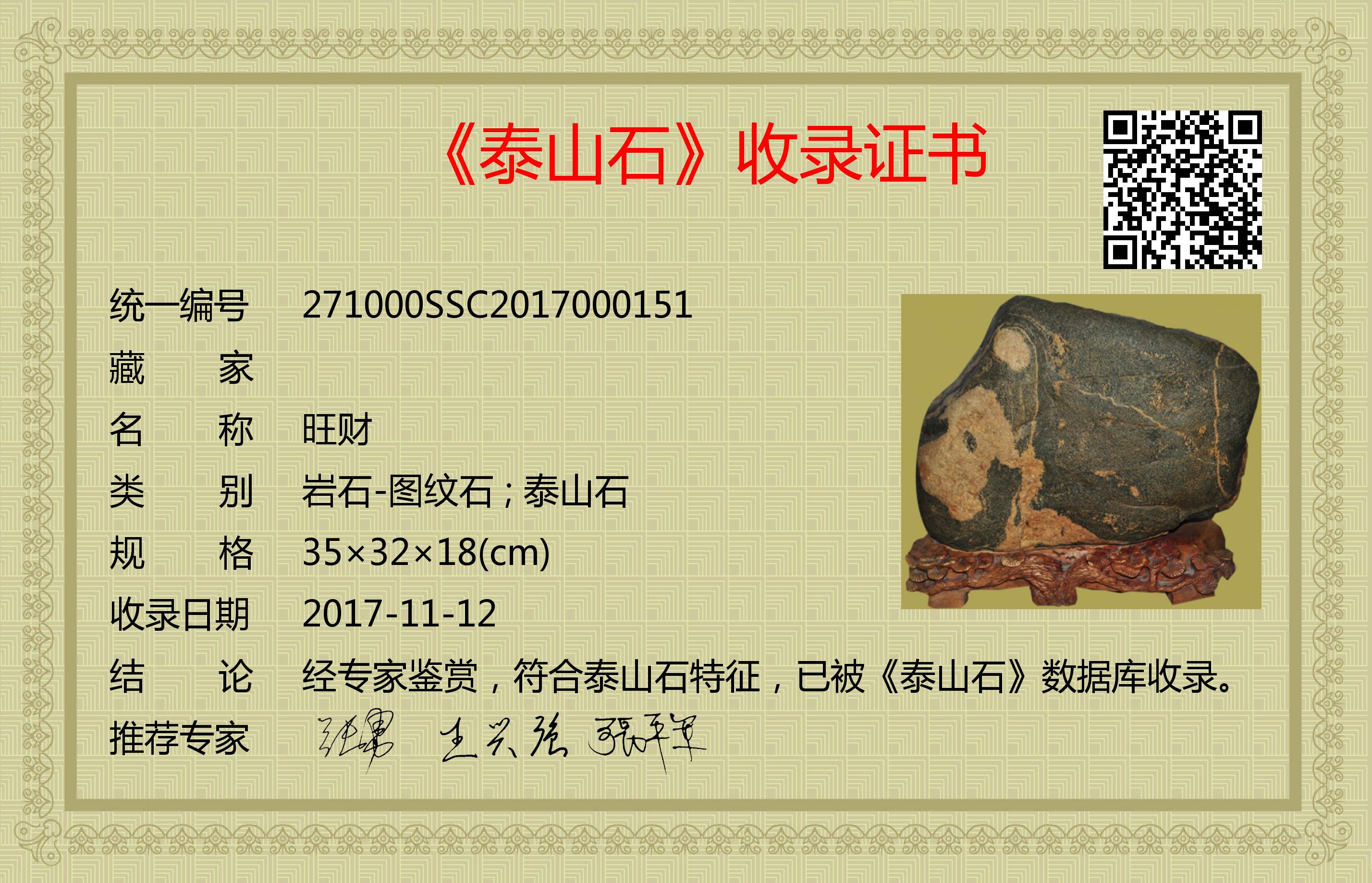 经专家鉴赏,符合泰山石特征,已被《泰山石》数据库收录。