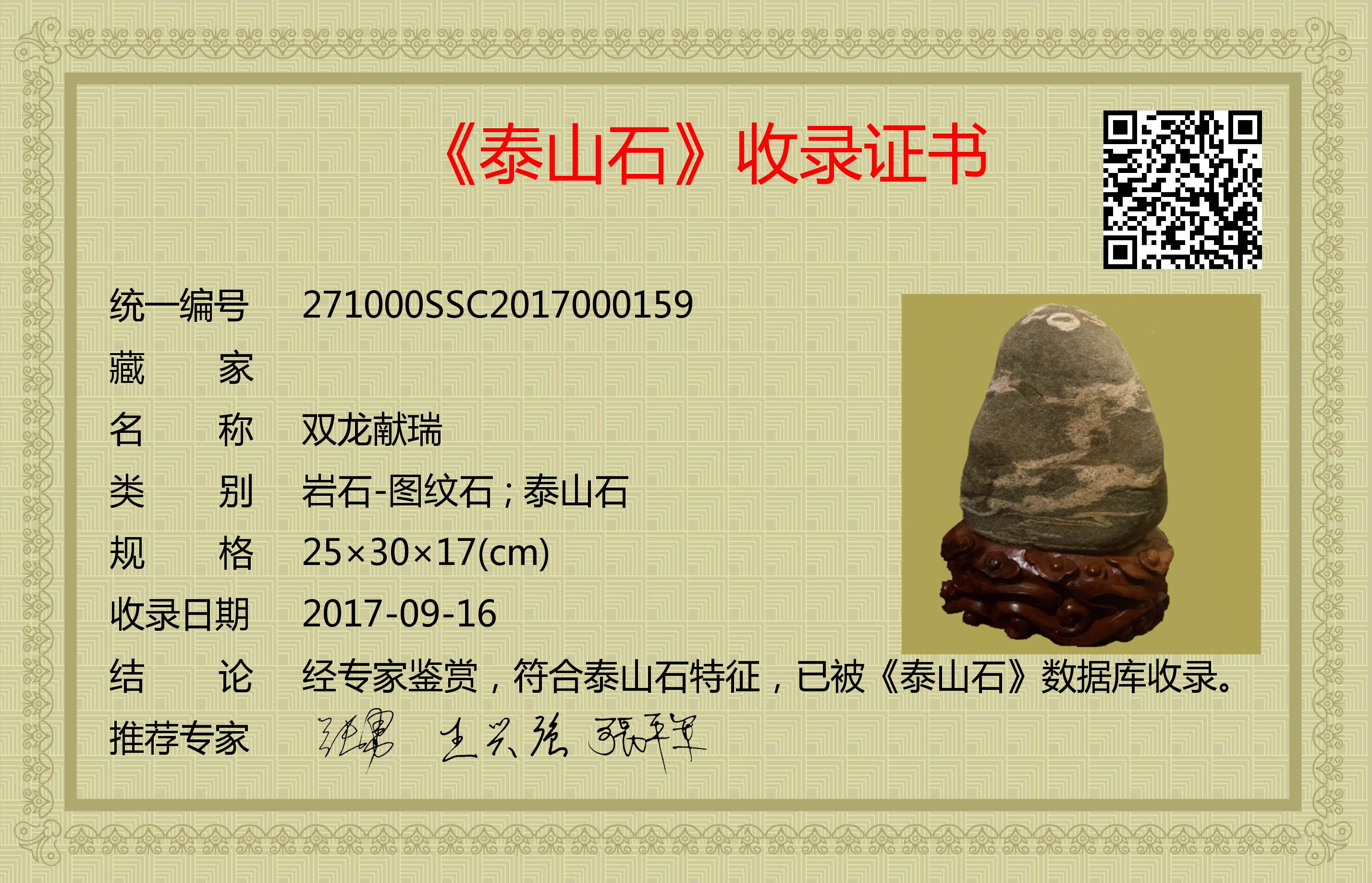 经专家鉴赏,符合泰山石特征,已被《泰山石》数据库收录。
