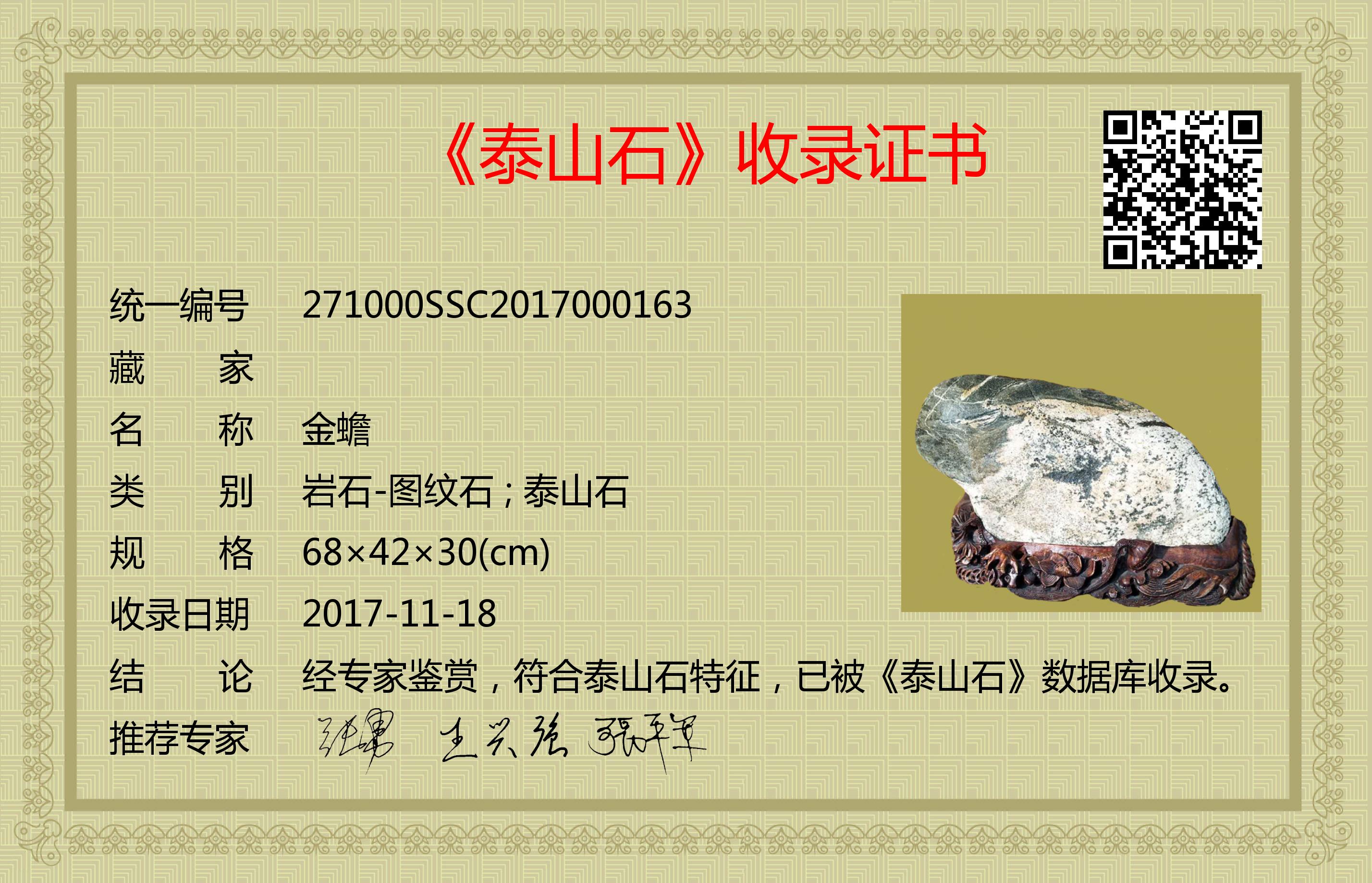 经专家鉴赏,符合泰山石特征,已被《泰山石》数据库收录。