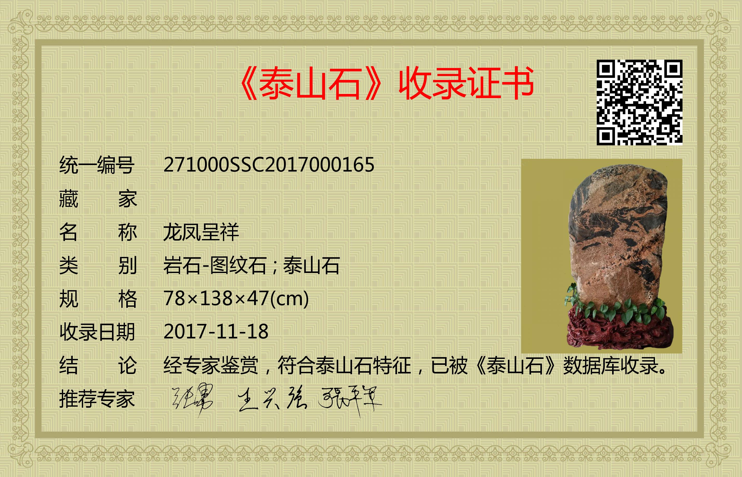 经专家鉴赏,符合泰山石特征,已被《泰山石》数据库收录。