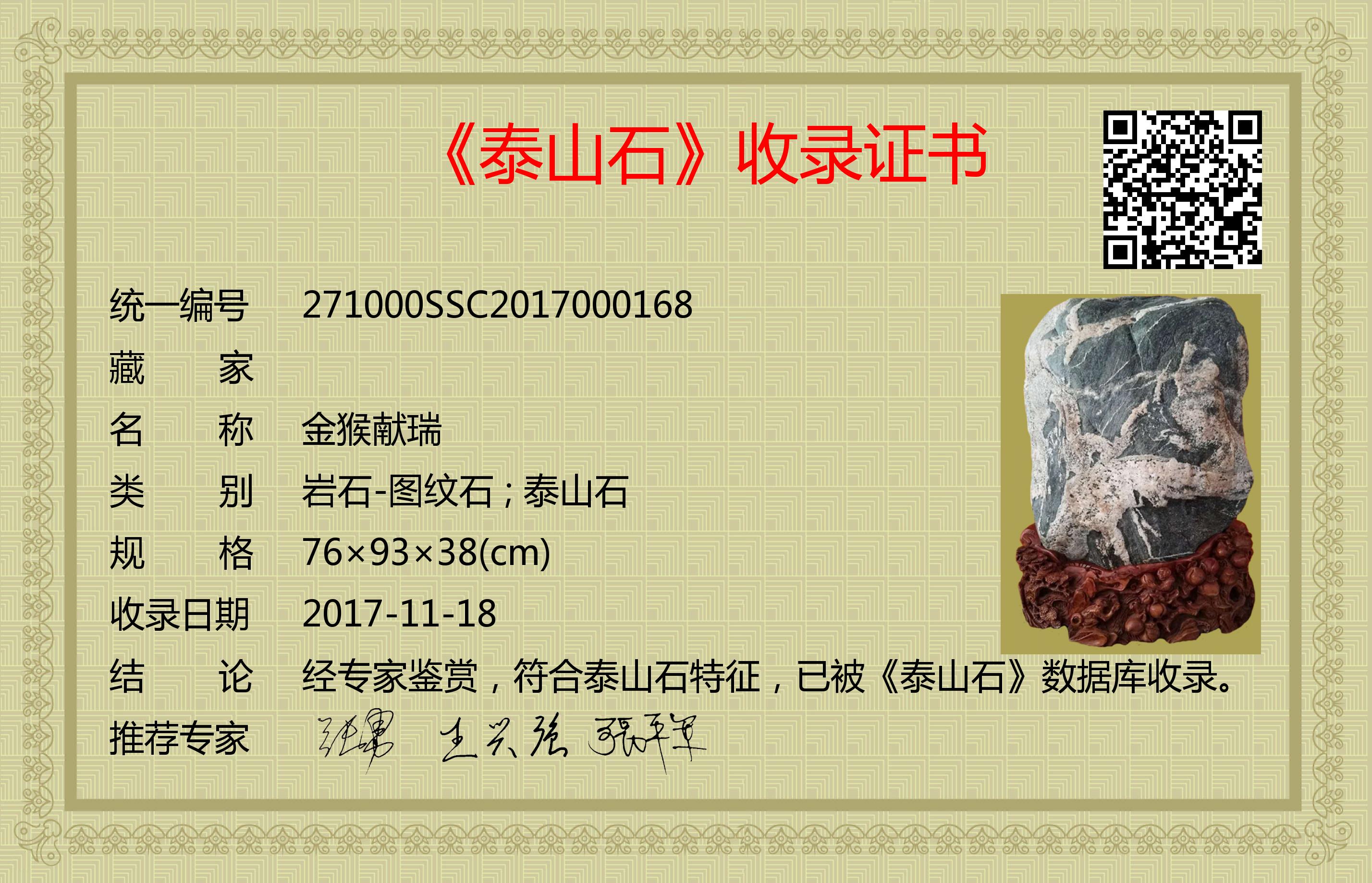 经专家鉴赏,符合泰山石特征,已被《泰山石》数据库收录。
