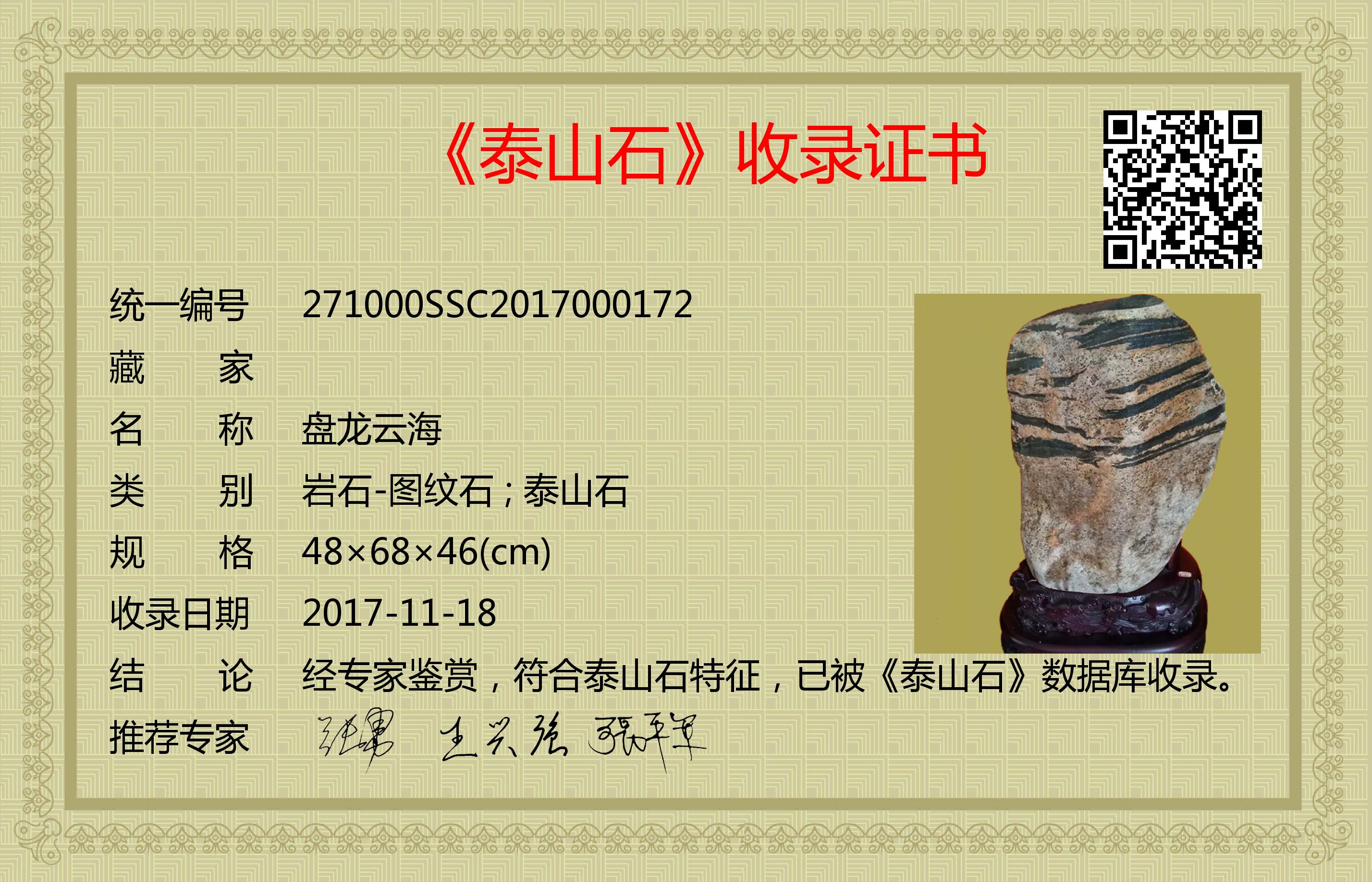 经专家鉴赏,符合泰山石特征,已被《泰山石》数据库收录。