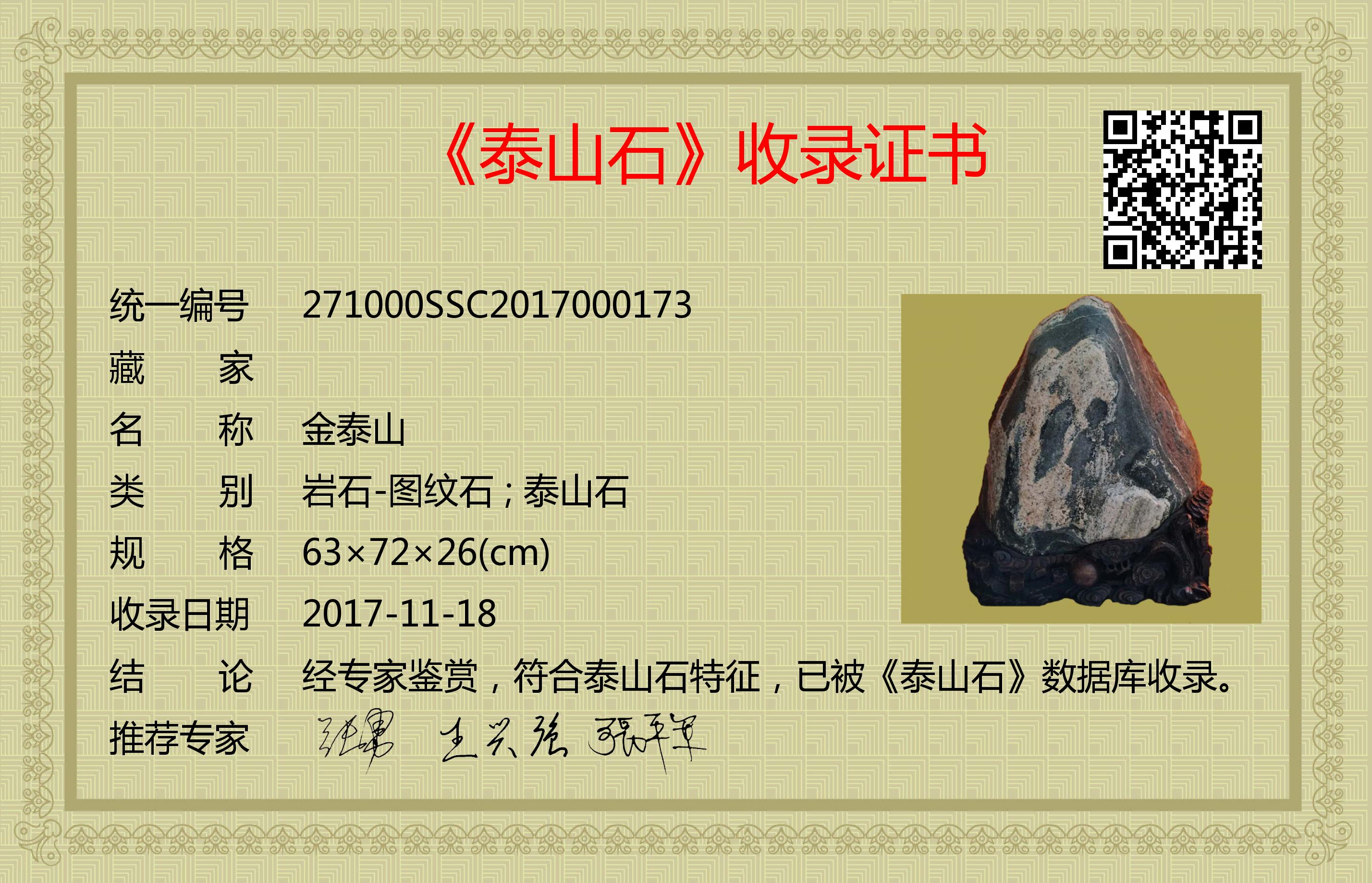 经专家鉴赏,符合泰山石特征,已被《泰山石》数据库收录。