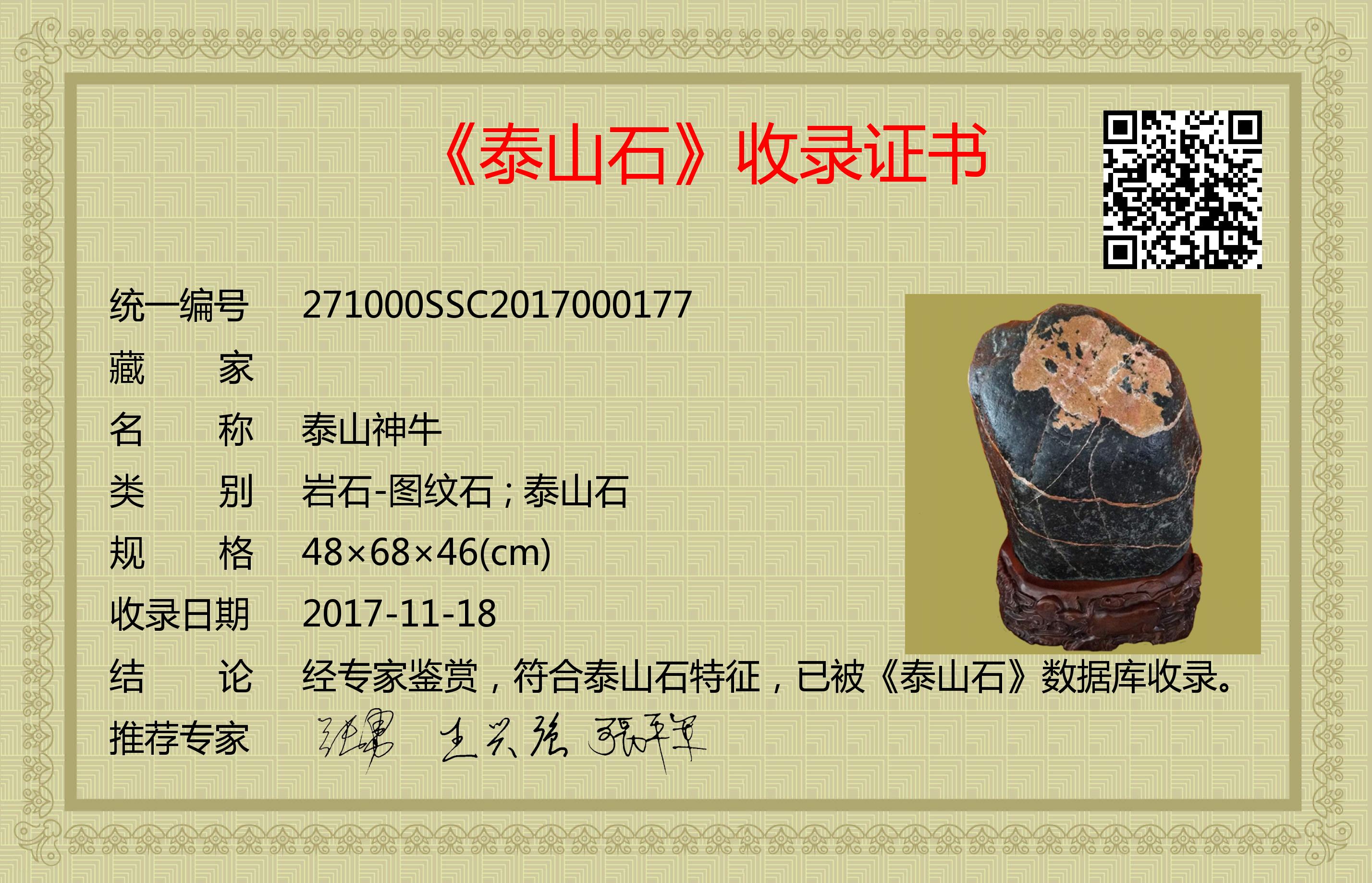 经专家鉴赏,符合泰山石特征,已被《泰山石》数据库收录。
