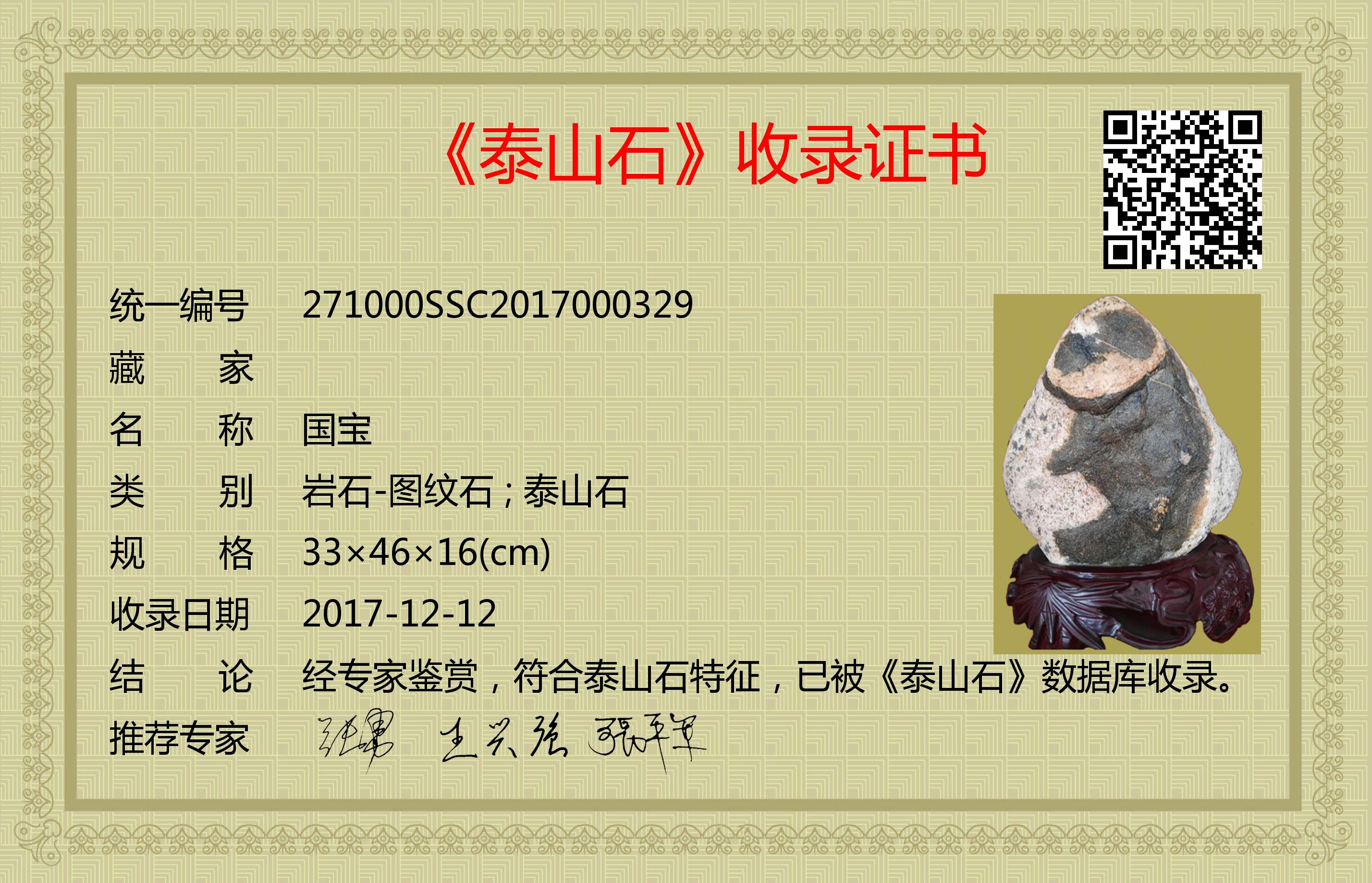 经专家鉴赏,符合泰山石特征,已被《泰山石》数据库收录。
