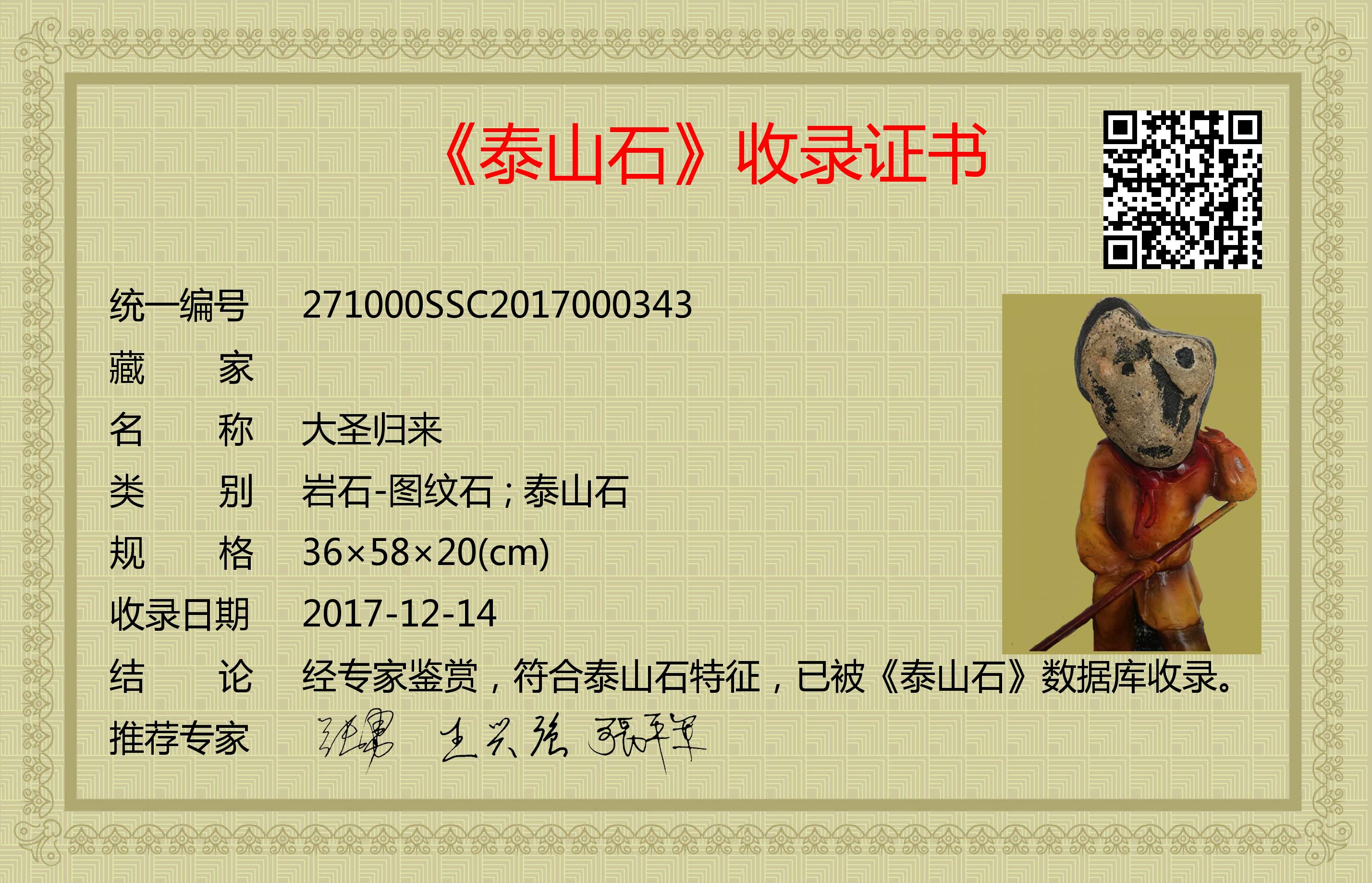 经专家鉴赏,符合泰山石特征,已被《泰山石》数据库收录。