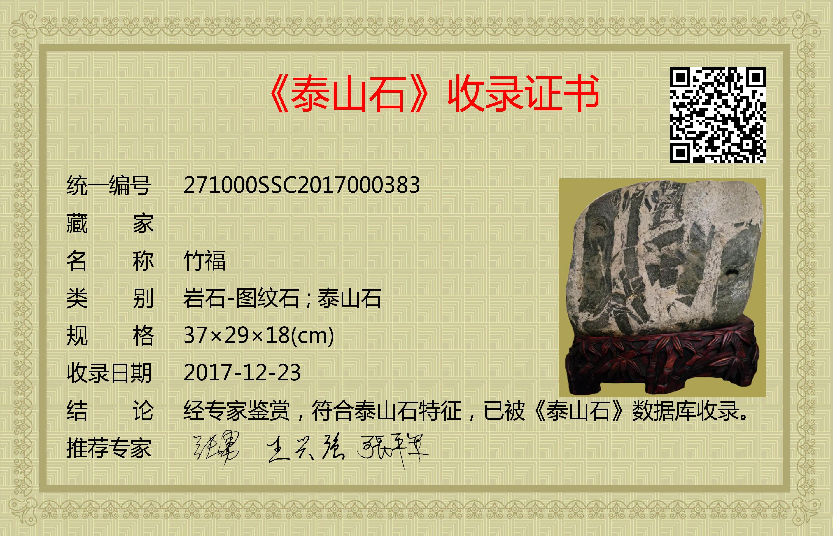经专家鉴赏,符合泰山石特征,已被《泰山石》数据库收录。