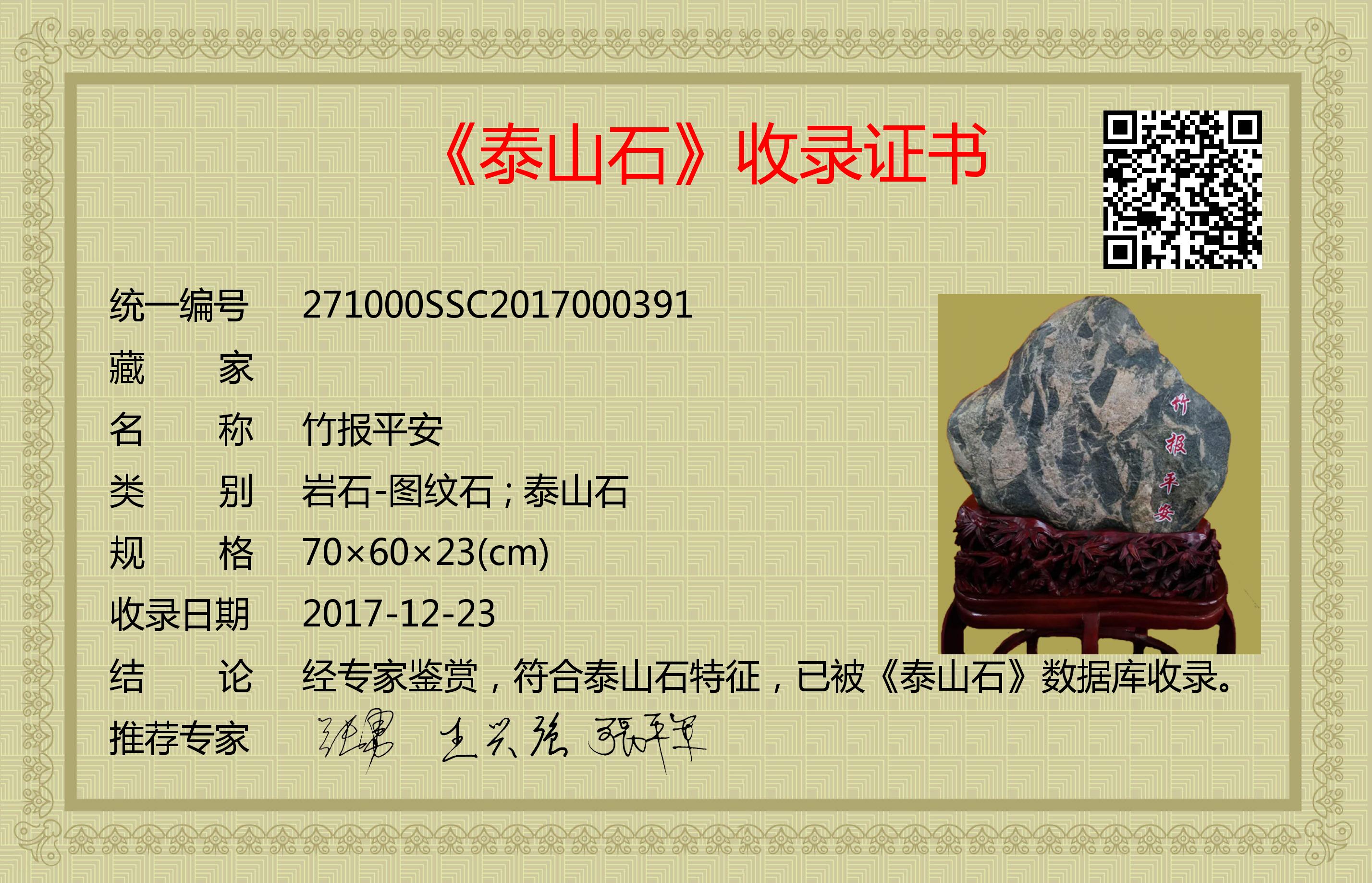 经专家鉴赏,符合泰山石特征,已被《泰山石》数据库收录。