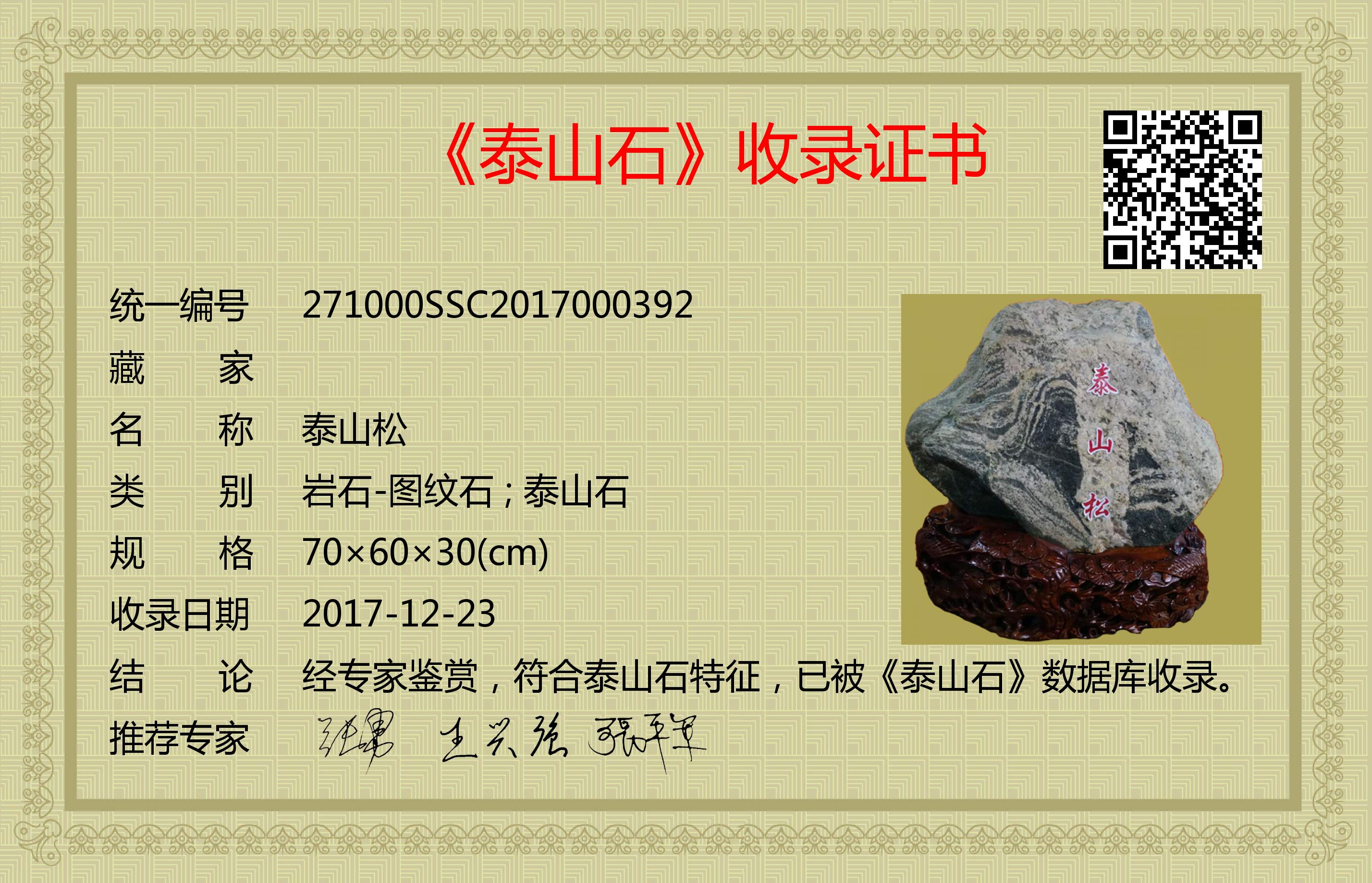 经专家鉴赏,符合泰山石特征,已被《泰山石》数据库收录。