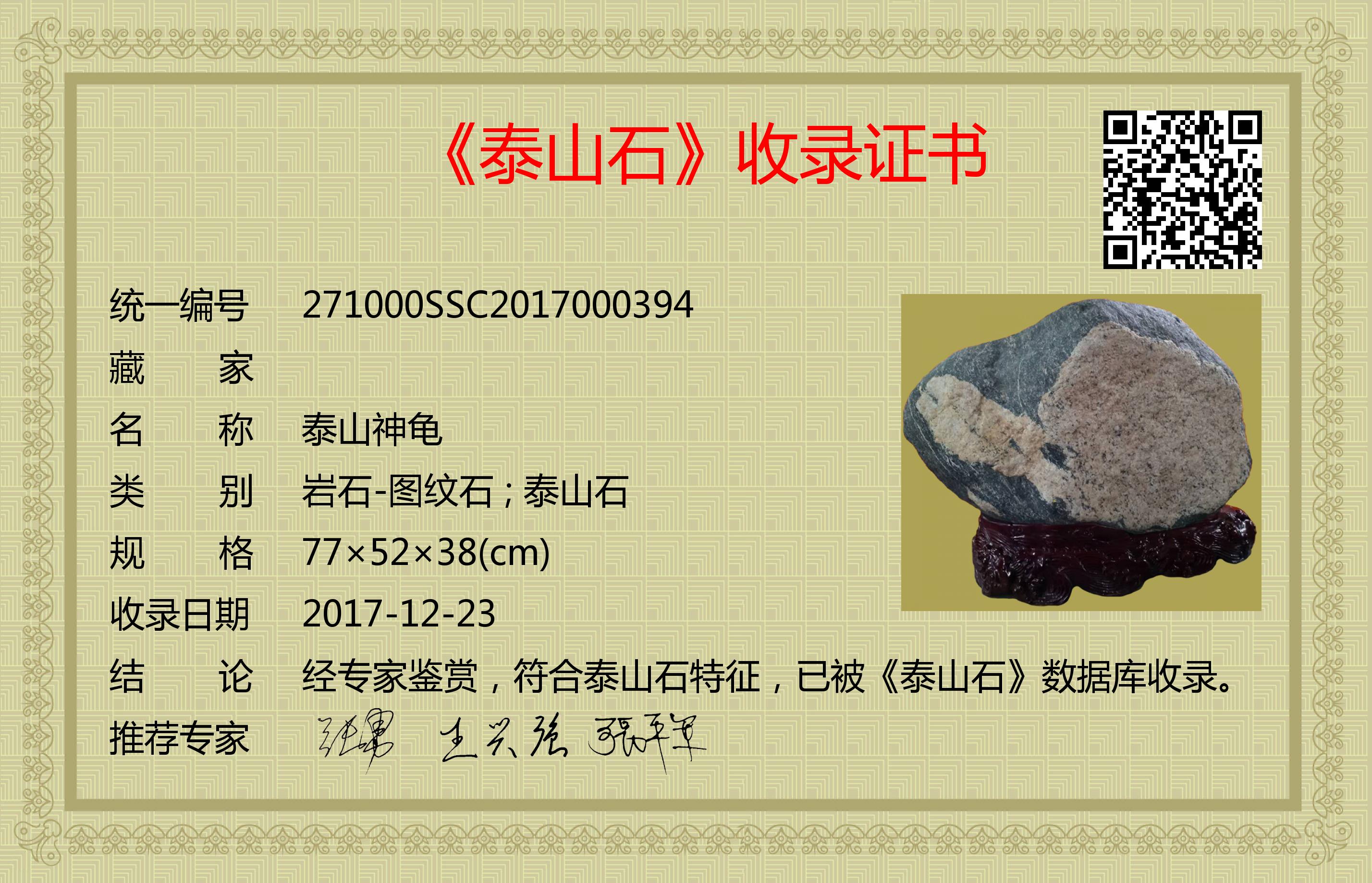 经专家鉴赏,符合泰山石特征,已被《泰山石》数据库收录。