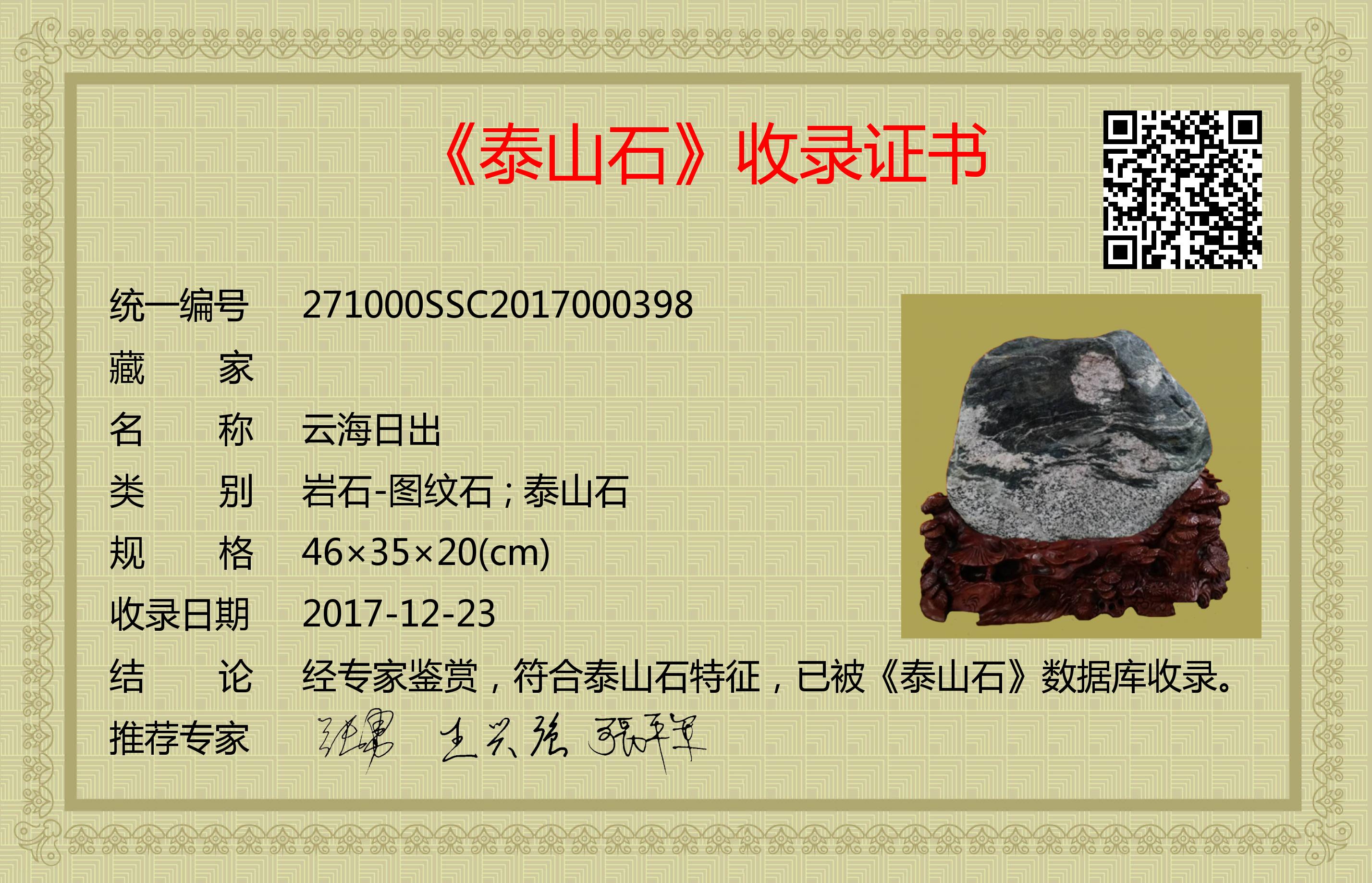 经专家鉴赏,符合泰山石特征,已被《泰山石》数据库收录。