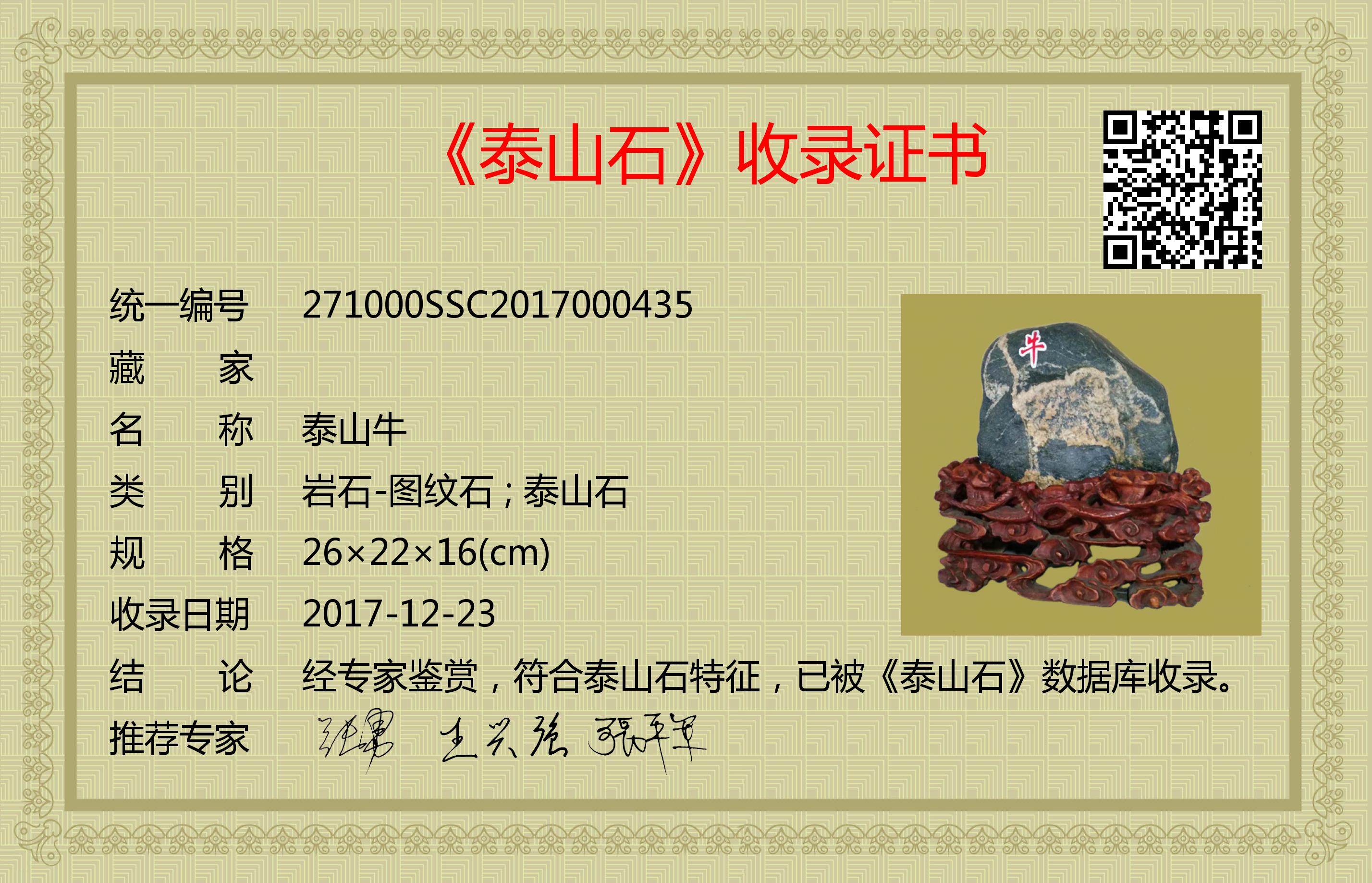 经专家鉴赏,符合泰山石特征,已被《泰山石》数据库收录。