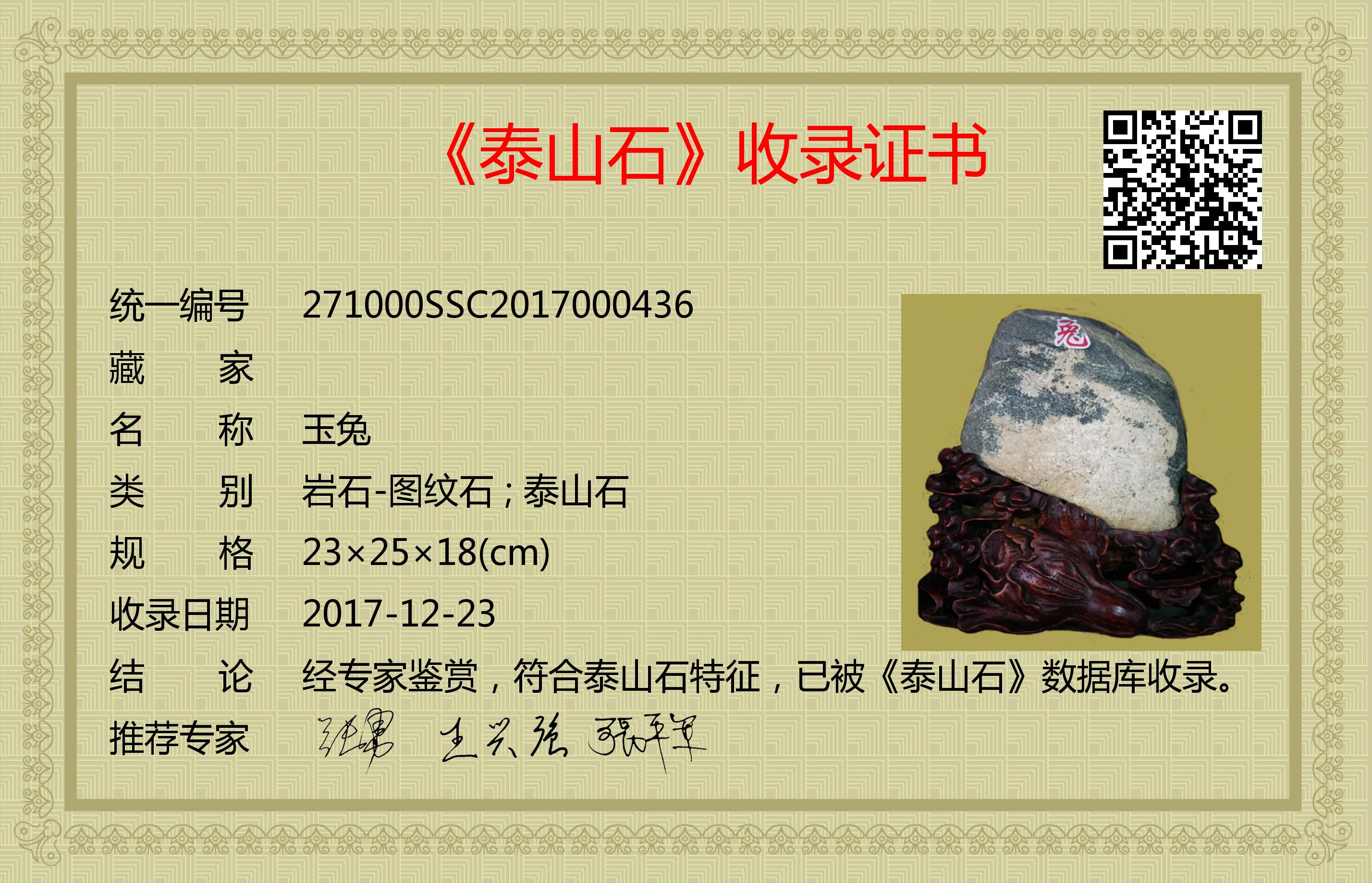 经专家鉴赏,符合泰山石特征,已被《泰山石》数据库收录。
