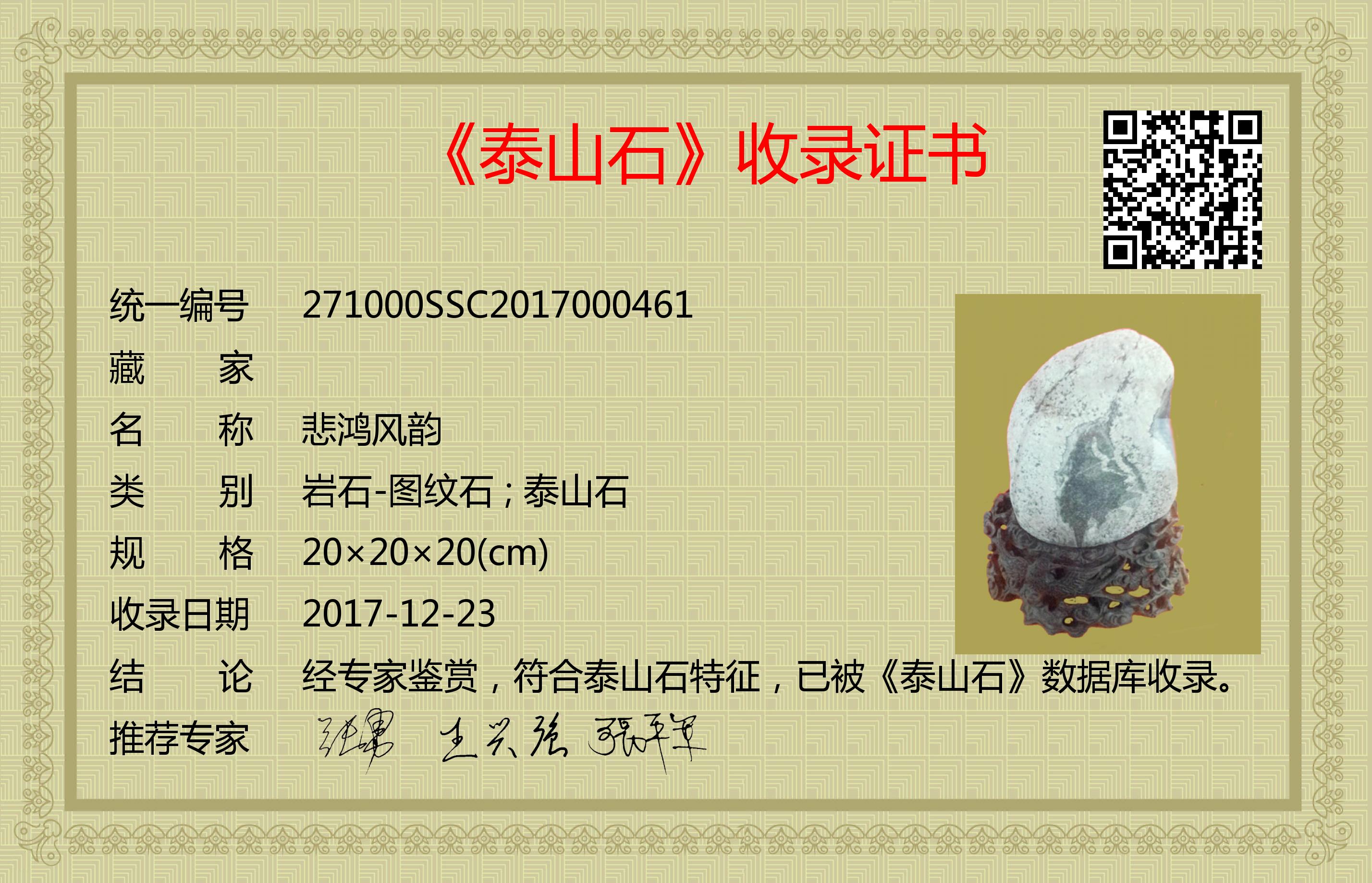 经专家鉴赏,符合泰山石特征,已被《泰山石》数据库收录。