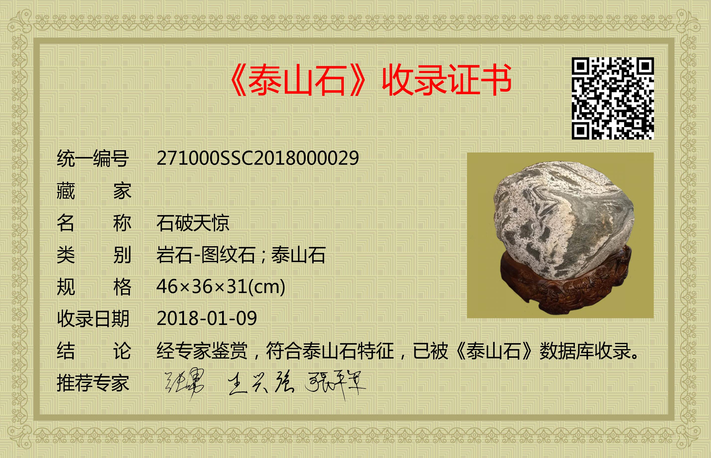 经专家鉴赏,符合泰山石特征,已被《泰山石》数据库收录。