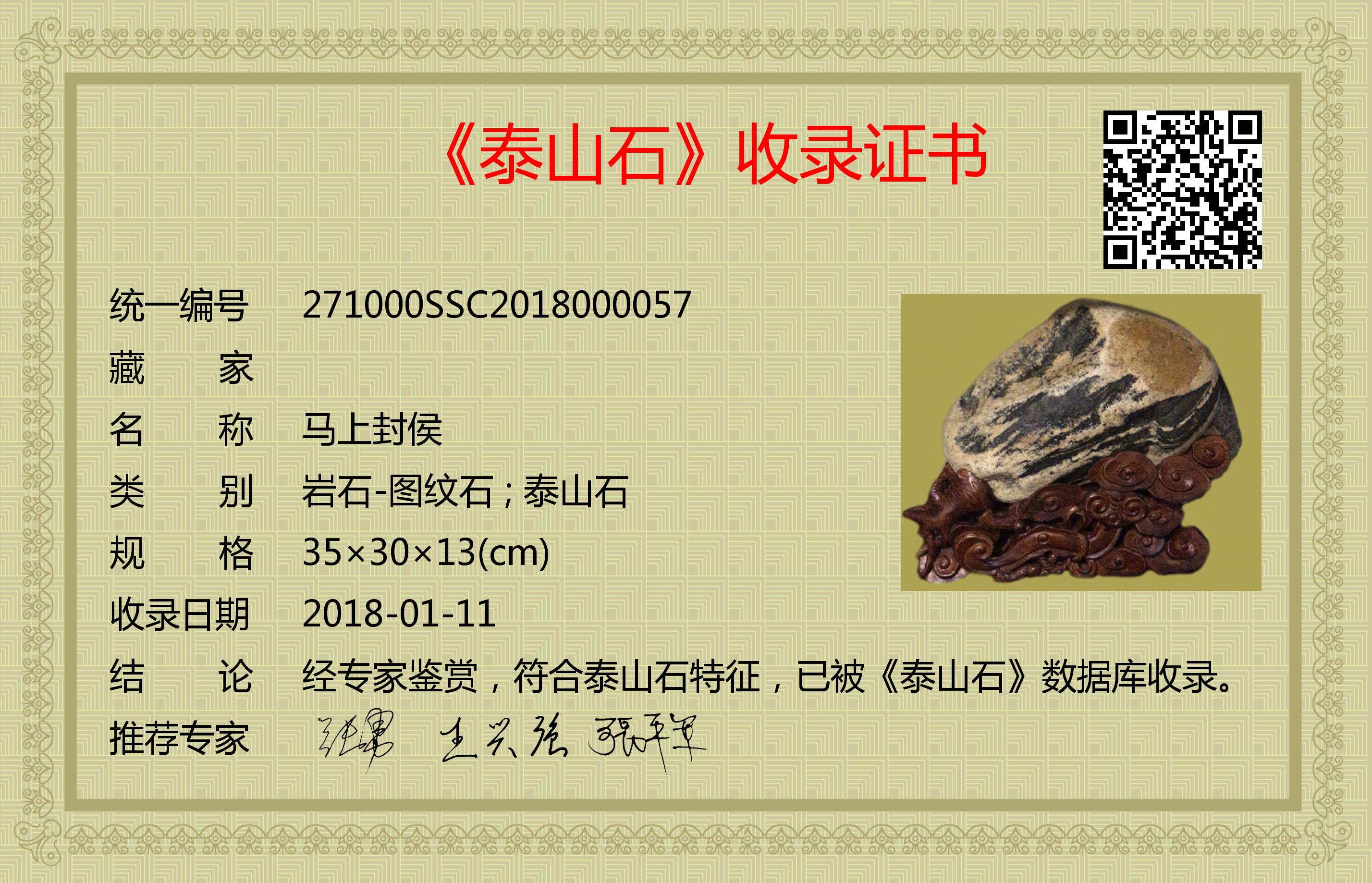 经专家鉴赏,符合泰山石特征,已被《泰山石》数据库收录。