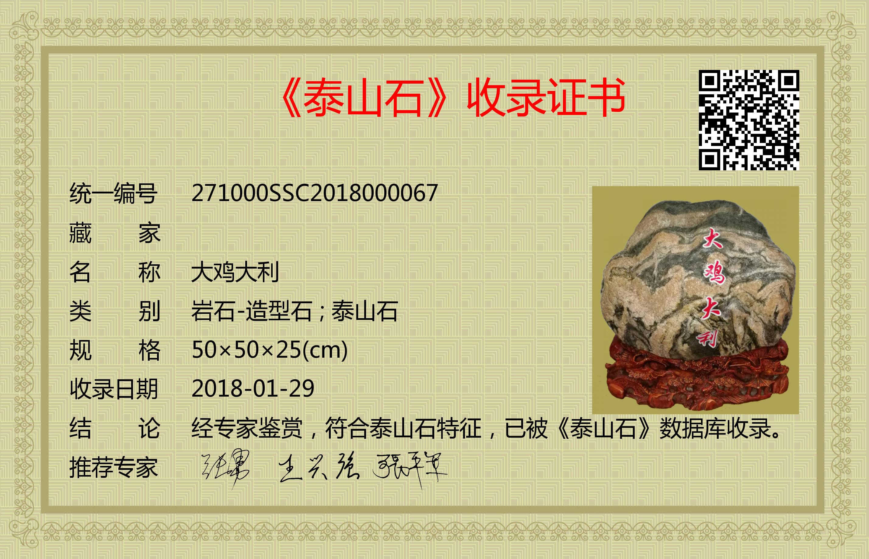 经专家鉴赏,符合泰山石特征,已被《泰山石》数据库收录。