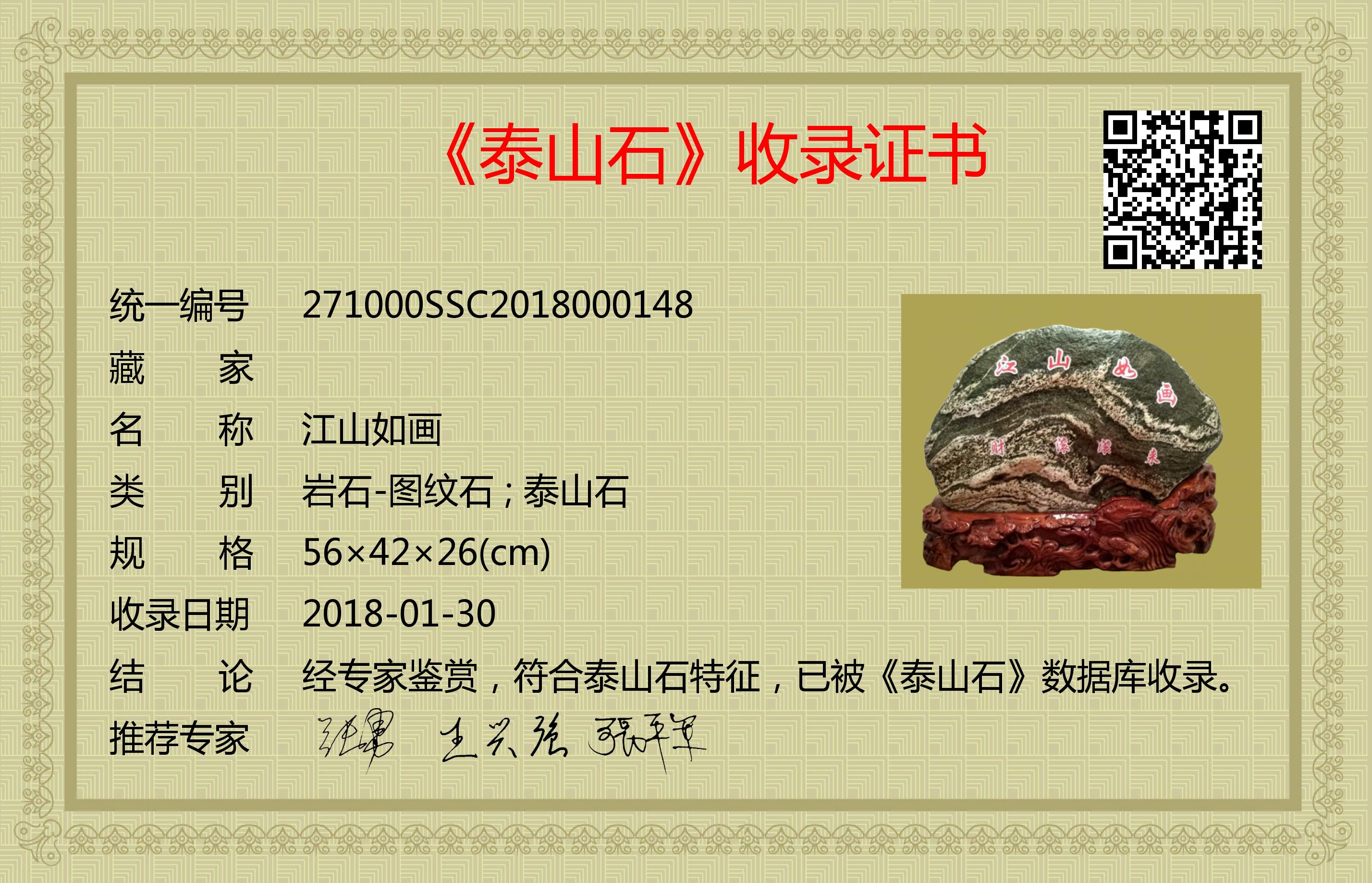 经专家鉴赏,符合泰山石特征,已被《泰山石》数据库收录。